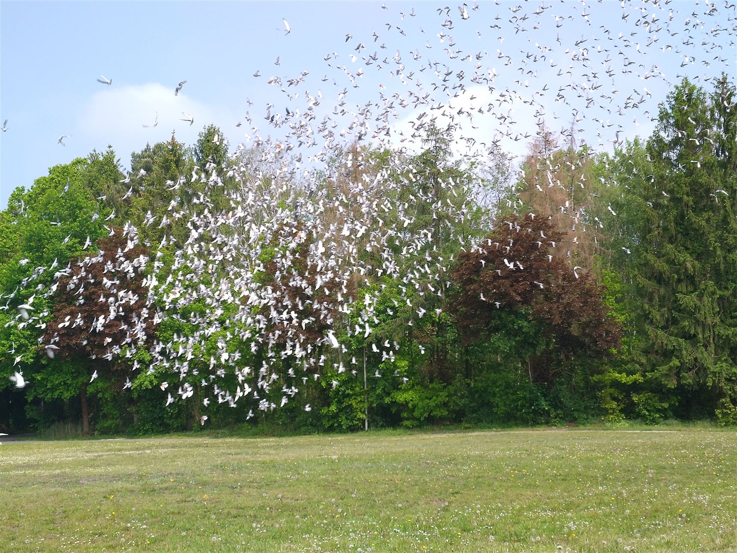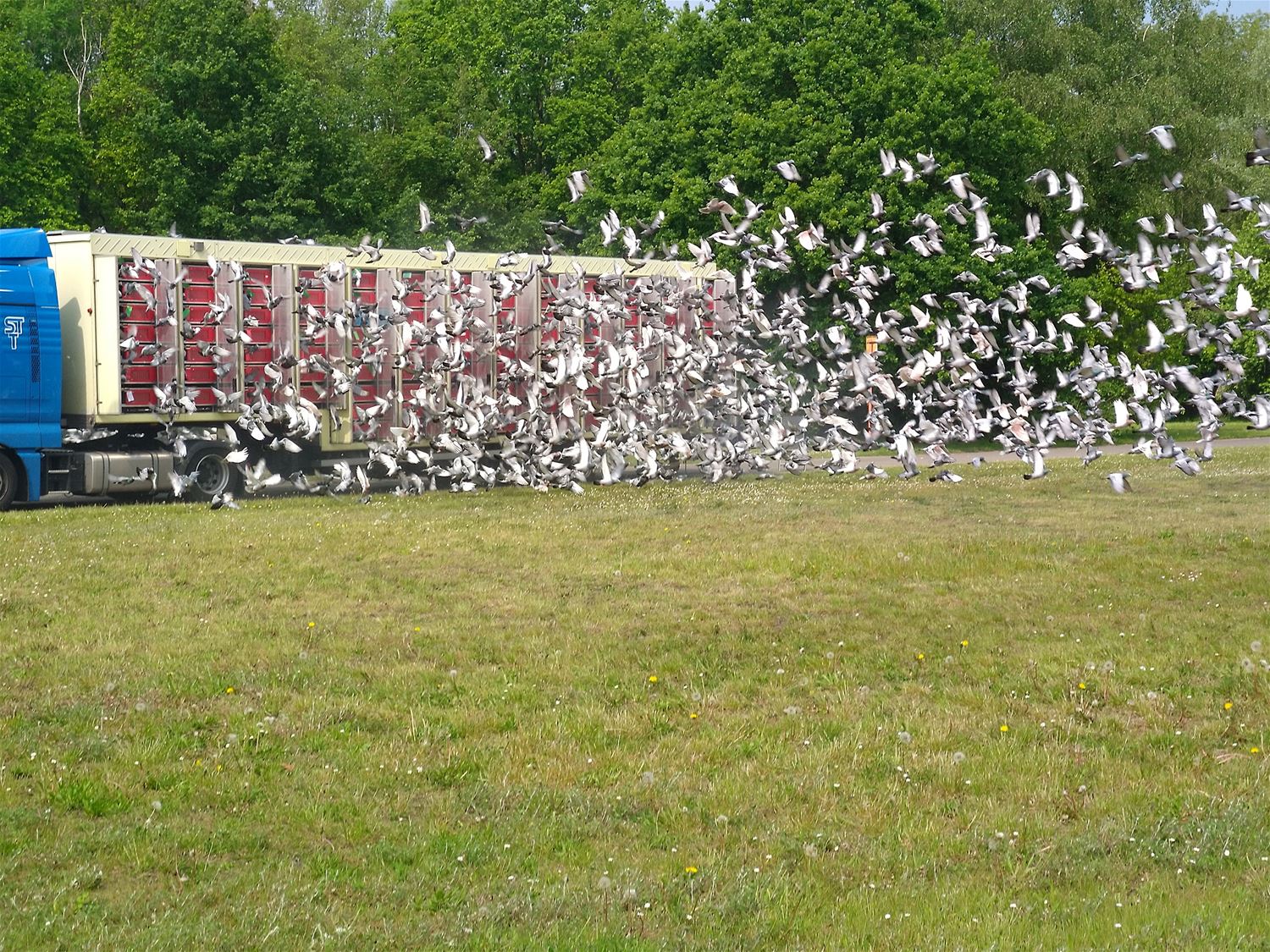 Terwijl de laagvliegers het tegen elkaar opnamen op Circuit Zolder, vertrokken de hoogvliegers vanop het Helzoldterrein. Liefst 5.200 duiven werden daar gelost voor hun snelheidswedstrijd. Ze stoven de lucht in, op weg naar hun hok in Oost-Nelderland. Een vlucht van 230 tot 300 km, waarvoor ze goed 5 uur nodig hebben. (foto’s Marcel Veltjen)46829