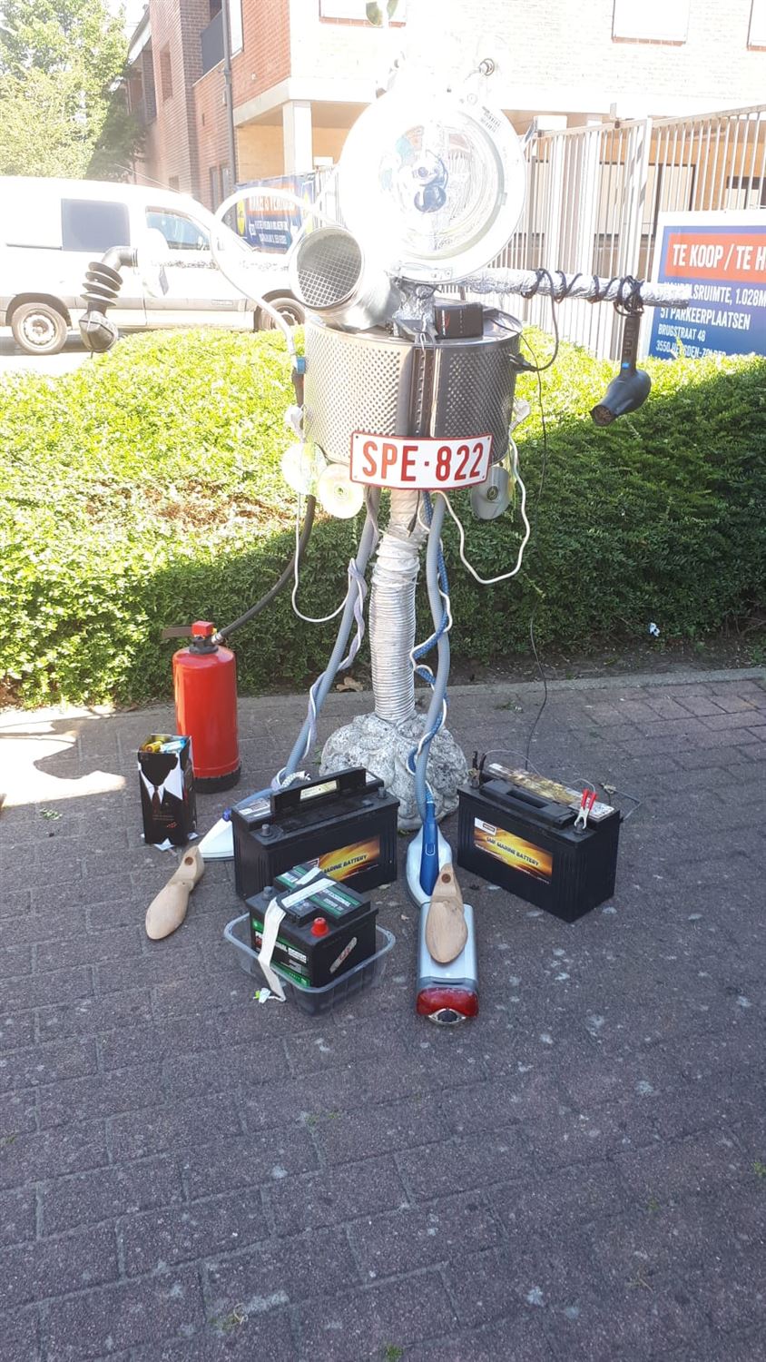 Niet alleen in Eversel-Ubbersel staan heel wat vogelverschrikkers. Ook in Heusden-Centrum dat eigenlijk niet aan de actie deelneemt, vind je twee opvallende exemplaren. Karin Cerstelotte zette in de Brugstraat Electra 822 buiten. Een tijdje later zorgde een wilde weldoener ervoor dat hij ook nog van stroom voorzien werd. En Julien Maebe voegde er vandaag in de Guido Gezellelaan - met de hulp van zijn kleinzoon en diens vakantievriend - Janos aan toe. Die is geïnspireerd op de Cosmogolem van Koen Vanmechelen en heeft vier gezichten, in elke windrichting kijkt er eentje.
