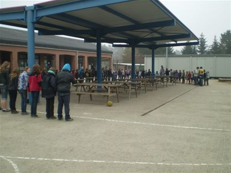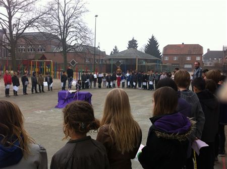 Ook in Heusden-Zolder werd om 11 uur één minuut stilte gehouden in openbare diensten, bedrijven en scholen. Enkele bussen, auto's en vrachtwagens waren even aan de kant gaan staan. Nadien begonnen de rouwklokken te luiden. (foto Julien Maebe) Ook de scholen in Heusden-Zolder namen massaal deel. Zo hadden de kleuters en leerlingen van het eerste leerjaar van de St-Jan Berchmansschool in Viversel een een herdenkingshoekje gemaakt met kaarsjes, tekeningen, knutselwerkjes...waar ze even konden stilstaan bij de gebeurtenissen. (foto onder links) Ook in de Springplank Heusden en Eversel (foto's onder midden en rechts) werd een stilteminuut georganiseerd op de speelplaats, ook de kinderen die ondertussen in het zwembad waren hebben hun les onderbroken. Donderdag was er in de vijfde en zesde leerjaren ook al een bezinning, kinderen konden op gevoelenskaartjes hun emoties uiten. Er zijn berichten gepost in het rouwregister en de vensteraffiches van de gemeente zijn opgehangen.