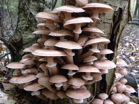 De echte Honingzwam of Armillaria mellea is één van de belangrijkste parasieten van bomen, omdat ze een intensieve witte rot veroorzaakt die leidt tot afsterven van de gastheer. De honingzwam vestigt zich tussen de schors en het hout. Met zogenaamde rizomorfen, een soort donkere stevige zwarte strengen (zoals veders) kunnen ze jarenlang in een gezond uitziende boom leven. Pas bij het verschijnen van de paddenstoelen blijkt de boom te zijn aangetast. Deze foto's heeft Stefan Was gemaakt in de Stukkenstraat Zolder.11672
