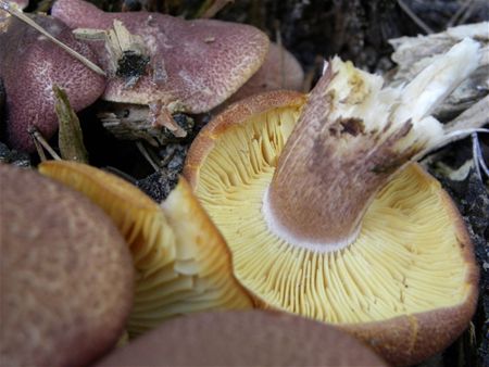 De koningsmantel of tricholomopsis rutilaus wordt ook wel purpergele ridderzwam genoemd. Het is een fraaie paddenstoel, die in de zomer en de herfst gewoonlijk in bundels, stronken van sparen en dennen siert. Dit jonge exemplaar stond in vol ornaat op de Beringerheide. (foto Stefan Was)11699
