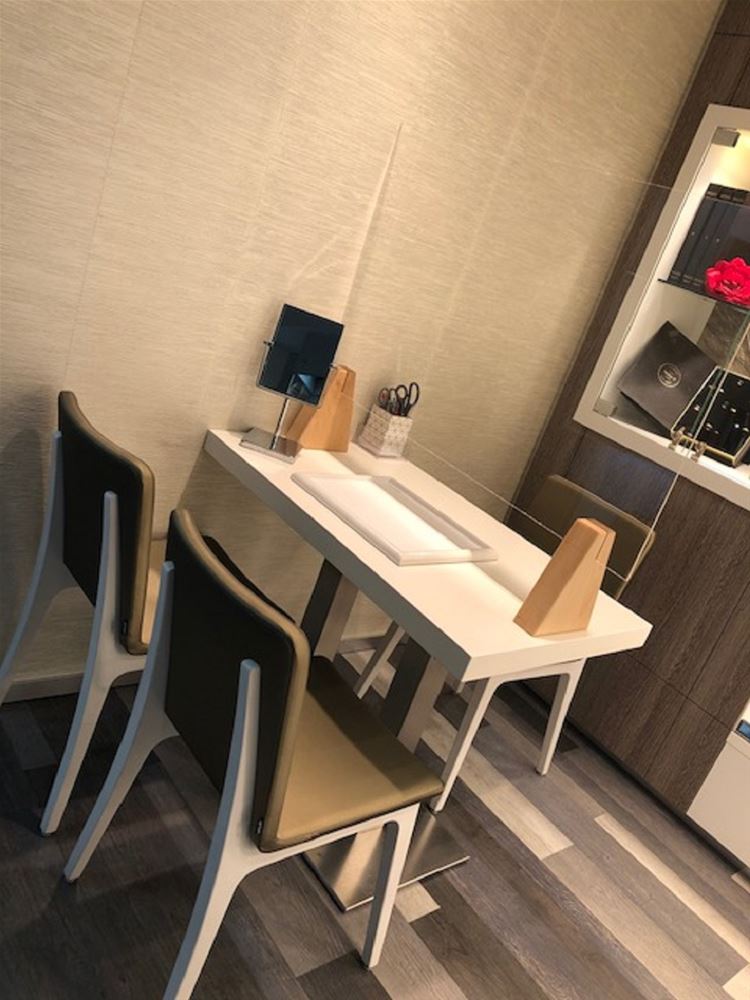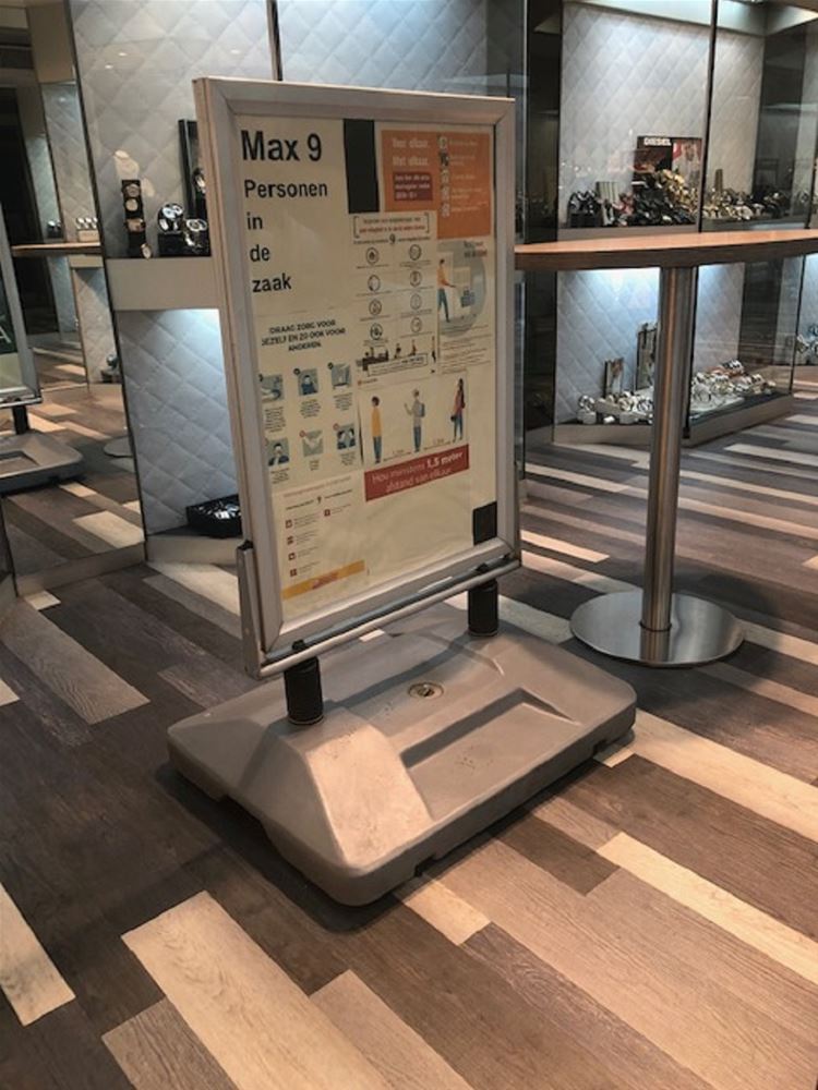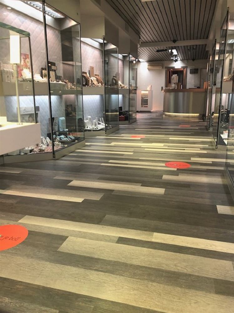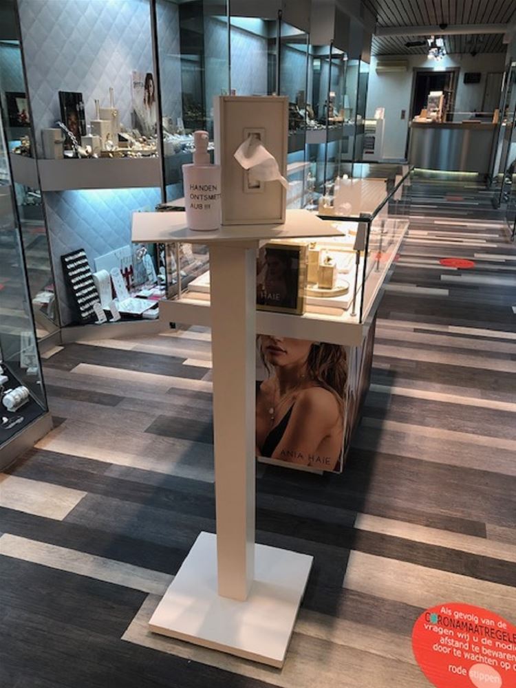 Bij juwelier De Greeve in de Koolmijnlaan zijn ze ook klaar om maandag te openen, de wekelijkse sluitingsdag wordt dus deze keer overgeslagen. Bij het binnenkomen kunnen de klanten meteen hun handen ontsmetten - "We hebben grote hoeveelheden ontsmettingsgel aangekocht", - er zijn handschoentjes ter beschikking en voor wie binnenkomt zonder mondmasker liggen die ook klaar. Het passen van uurwerken en juwelen is immers een delicate zaak. Daarom zijn op de toonbanken en de tafels voor klantencontact ook plexischermen geplaatst. Bollen op de grond zorgen voor de afstanden er worden 9 klanten tegelijk binnengelaten.