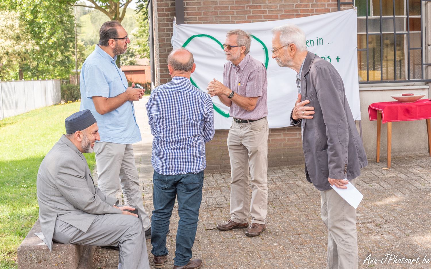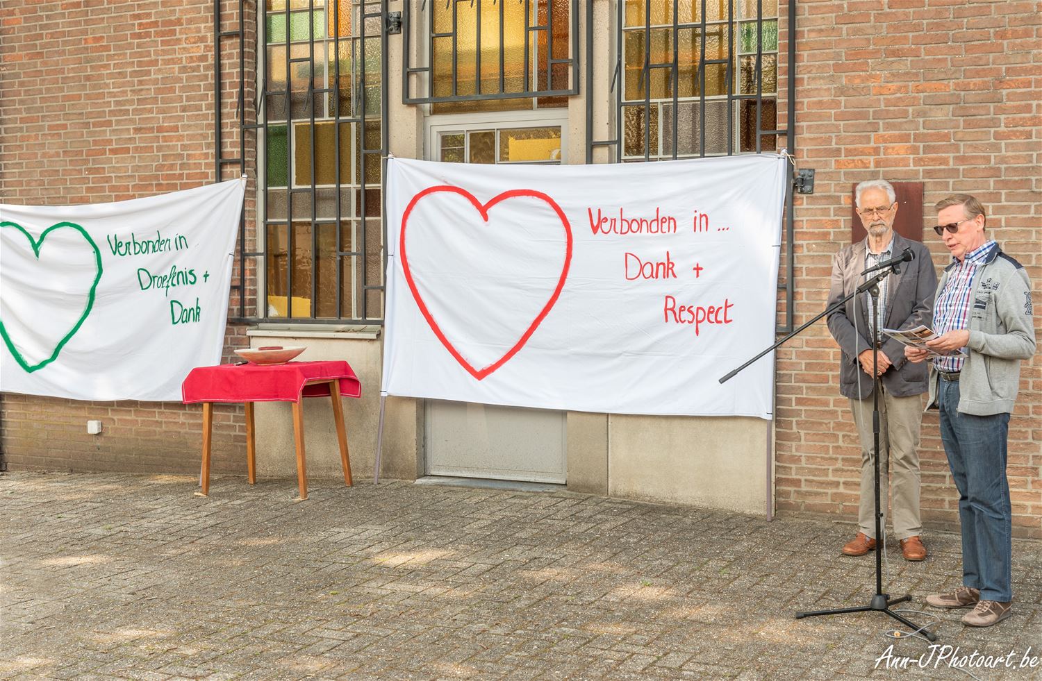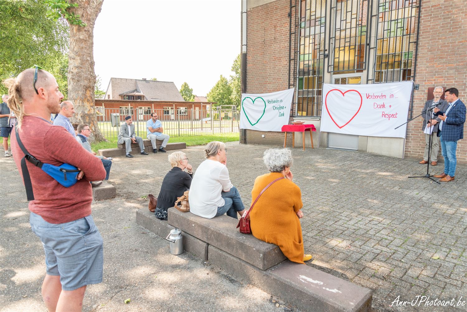 De interreligieuze werkgroep hield deze namiddag op Lindeman, tussen de kerk en La Baracca een zogenaamde 'cirkel van stilte'. Daarbij werd bij de start van de vakantie een bewogen half jaar afgesloten. Er werd gebeden - uit de verschillende religies- voor de slachtoffers van de coronacrisis, op spandoeken werd de verbondenheid in dank en droefenis uitgedrukt en er werden kaarsen ontstoken. Ze stonden ook stil bij het feit dat alle belangrijke religieuze gebeurtenissen en feesten dit voorjaar niet samen konden gevierd worden, daarom dat nog even - zij het in beperkte kring - een moment van verbondenheid werd tot stand gebracht. Ook burgemeester Mario Borremans kwam dat met een korte toespraak onderschrijven. (foto's Ann Jordens)59316