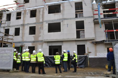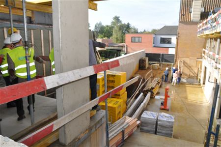 Een bijzondere dag vandaag voor de toekomstige bewoners van residentie Weydomp op de hoek van de Koerselsebaan en de Noordberm. Zij konden vandaag voor het eerst op de werf kennismaken met hun woning waarvan nu de ruwbouw bijna af is. Het was voor de eigenaars kijken en plannen waar wat zal komen, en een praatje slaan met hun toekomstige buren. Weydomp bestaat uit 20 luxe-appartementen en 2 handelszaken."Het project ligt midden op de verbinding tussen stationsbuurt en Heusden-Centrum, een aantrekkelijke locatie want in een mum van tijd kregen 55 % van de appartementen een eigenaar," zegt vastgoedmakelaar Marc Swevers."In de plannen is veel aandacht besteed aan duurzaam bouwen en laag energieverbruik waarbij licht, lucht en ruimte centrale pijlers zijn." Het gebouw is volledig onderkelderd, met onder meer ruimte voor auto's en bergingen. Het project heeft een hele voorbereidingstijd achter de rug, de eerste plannen dateren van 8 jaar geleden. De toekomstige bewoners lieten vandaag horen dat het voor hen nu niet snel genoeg kan gaan maar ze moeten toch nog tot volgend jaar geduld hebben. Het gebouw is alvast gedoopt, net zoals een nieuw schip dat in de vaart gaat. (foto's Marina Poelmans)14323