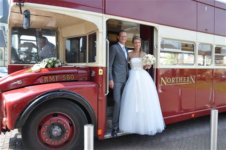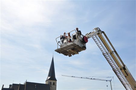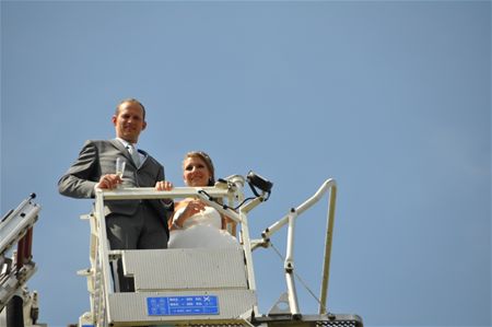 Schepen Robin Stroobants heeft er sinds vanmiddag een bevoegdheid bij, namelijk die van echtgenoot van Lize Cuppers. Het jonge koppel stapte vanmiddag in het huwelijksbootje, het huwelijk werd bezegeld door partijgenote en OCMW-voorzitster Elke Gijbels. Tot voor kort was Robin Stroobants schepen van brandweerzaken, het korps liet hem en zijn kersverse ega dan ook volgens traditie van de grond gaan in de elevator. Voor de rest mocht het gezelschap in een oldtimerbus stappen. (foto's Julien Maebe).16620
