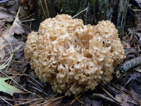 De grote sponszwam (Sparassis crispa) groeit aan de voet van naaldbomen van augustus tot oktober, een parasiet van dennen dus. Het grote vruchtlichaam (tot 18 cm hoog en 22 cm breed) ontwikkelt zich tussen de wortels. De paddenstoel lijkt op een crèmeachtige spons of bloemkool, met veel korte, platte lintachtige vertakkingen. De sponszwam heeft een milde smaak, maar moet eerst grondig gewassen worden. (foto Stefan Was)8557