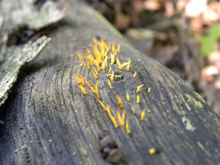 Het kleverig koraalzwammetje (calocera viscosa) is een fraaie paddenstoel, die zijn naam niet heeft gestolen. Hij is vrij algemeen verspreid en tussen juli en november te vinden op oude, rottende naaldhoutstompen. De hele zwam is kleverig en zo buigzaam als rubber. Op loofhout vind je de kleinere variant, de gele hoorntjes (calocera cornea, foto onder), met enkelvoudige of spaarzaam vertakte vruchtlichaampjes. De soorten zijn hoe danook ongenietbaar en taai. Dit exemplaar staat in de bossen Vansoest in Eversel. (foto's Stefan Was)8486
