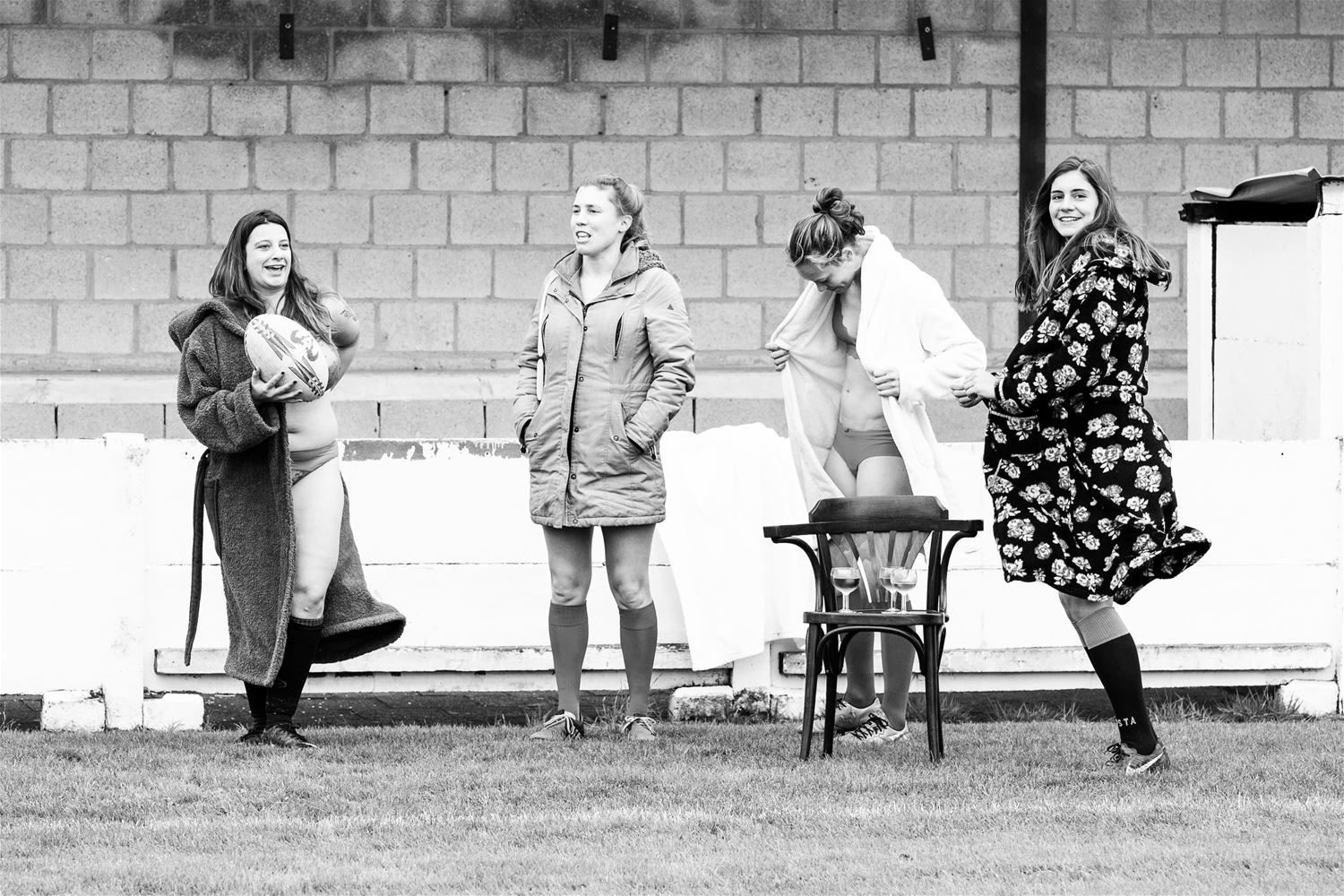 In de kleedkamers zijn de rugbydames wel wat gewoon en op het veld zijn het ook geen doetjes, maar bij het begin van de fotosessie voelden ze toch ongemakkelijk en stak stress de kop op. Hun lichamen op deze manier laten fotograferen, was immers helemaal nieuw. En dan ook nog de angst dat iedereen hun 'gebreken' zou kunnen zien. Degenen die het eerst voor de lens moesten, kregen dan ook stiekem een glaasje wijn om de spanning wat te breken. Maar er was nog een ander obstakel. Op het ogenblik van de fotosessie was nogal wat volk op de club aanwezig omdat de finale van het WK rugby op groot scherm werd vertoond. En tijdens de rust en na de wedstrijd moest er opvallend veel volk plots een luchtje gaan scheppen. Pottenkijkers en voyeurs dus, maar uiteindelijk lieten de dames het over zich heen gaan.