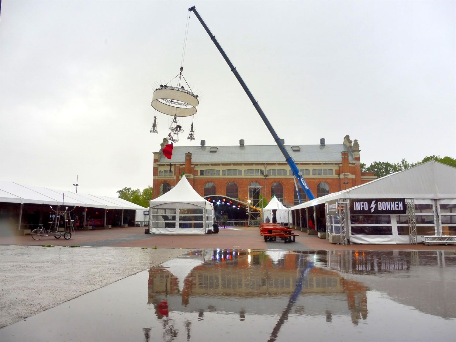 Een stortbui en windstoten konden deze namiddag Theater Tol niet tegenhouden om op het Marktplein een algemene repetitie te houden voor het grote luchtspektakel van vanavond. Het is een adembenemende show tegen het prachtige decor van de mijngebouwen die straks nog versterkt wordt met kostuums en lichteffecten. Als de weergoden zich Mijn-Kracht-minded tonen, dan wordt het om 21 uur een enorm spektakelstuk.46608