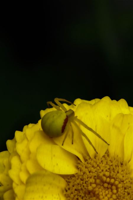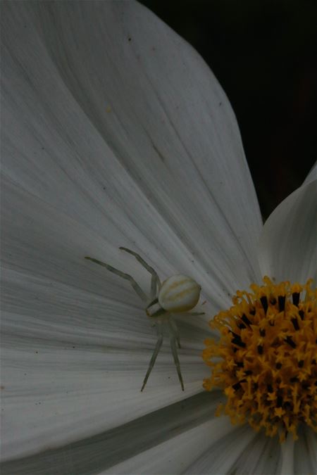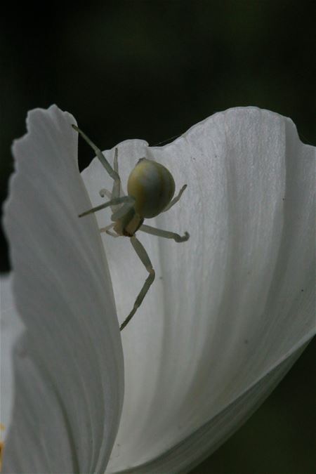In de tuin van Frans Morawski zaten vandaag een witte en een gele kameleonspin. (foto's Ria De Clerck) UPDATE Pierre Rutten laat nog weten dat er verschillende soorten kameleonspillen in de natuur voorkomen, maar deze past haar kleur aan de omgeving aan.