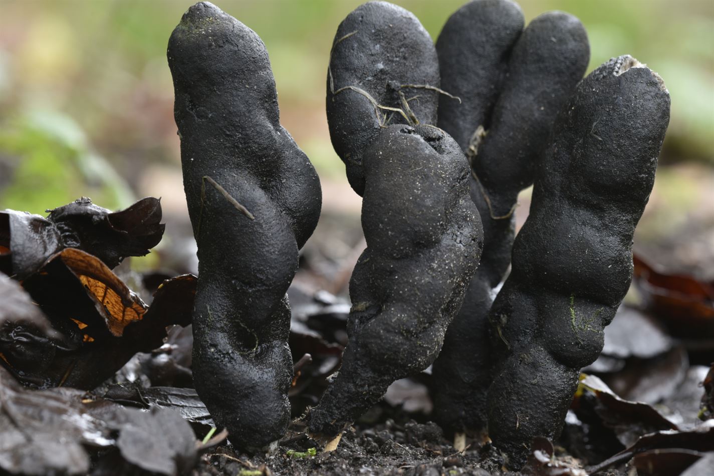 Dit is de houtknotszwam. Die wordt 4 tot 10 cm hoog en is meestal vingerdik. Hij heeft zijn naam niet gestolen want hij is knots- of vingervormig tot knolvormig. Hij groeit in de herfst op dode stronken en wortels van loofbomen, zoals hier in Bolderberg. (foto Roger Convents)