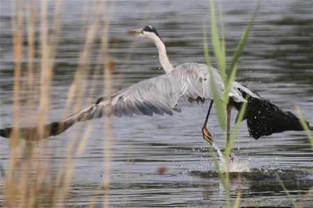 Een blauwe reiger laat zich drijven op het water van De Wijers, om dan even later op te vliegen. (foto's Marcel Gybels)22354
