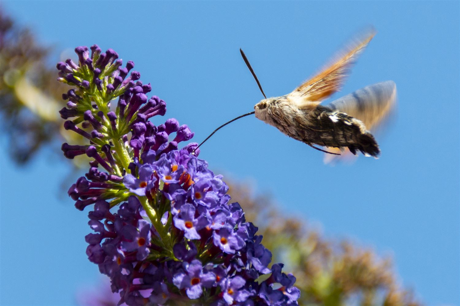 Hij moest snel zijn, maar Gust Put heeft een mooie foto kunnen maken van een kolibrievlinder aan zijn vlinderstruik. De vlinder doet sterk denken aan de gelijknamige vogel om zijn snelle vleugelslag terwijl hij stilhangt. Met zijn erg lange tong haalt hij de nectar uit bloemen. Het is overigens een trekvlinder, die in de winter richting Noord-Afrika vliegt.