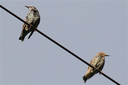 De hele spreeuwenfamilie verzamelt op een elektriteitsdraad in Heusden, hoewel één koppeltje het niet helemaal eens lijk te raken over de richting. (foto's Marcel Gybels)22737