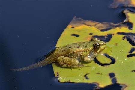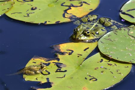 Merkwaardig, een kikker die bijna volwassen is en nog een flinke staart heeft. De vader of moeder kijkt ernaar en snapt er ook niks van. (foto's Jan Leijskens)22282