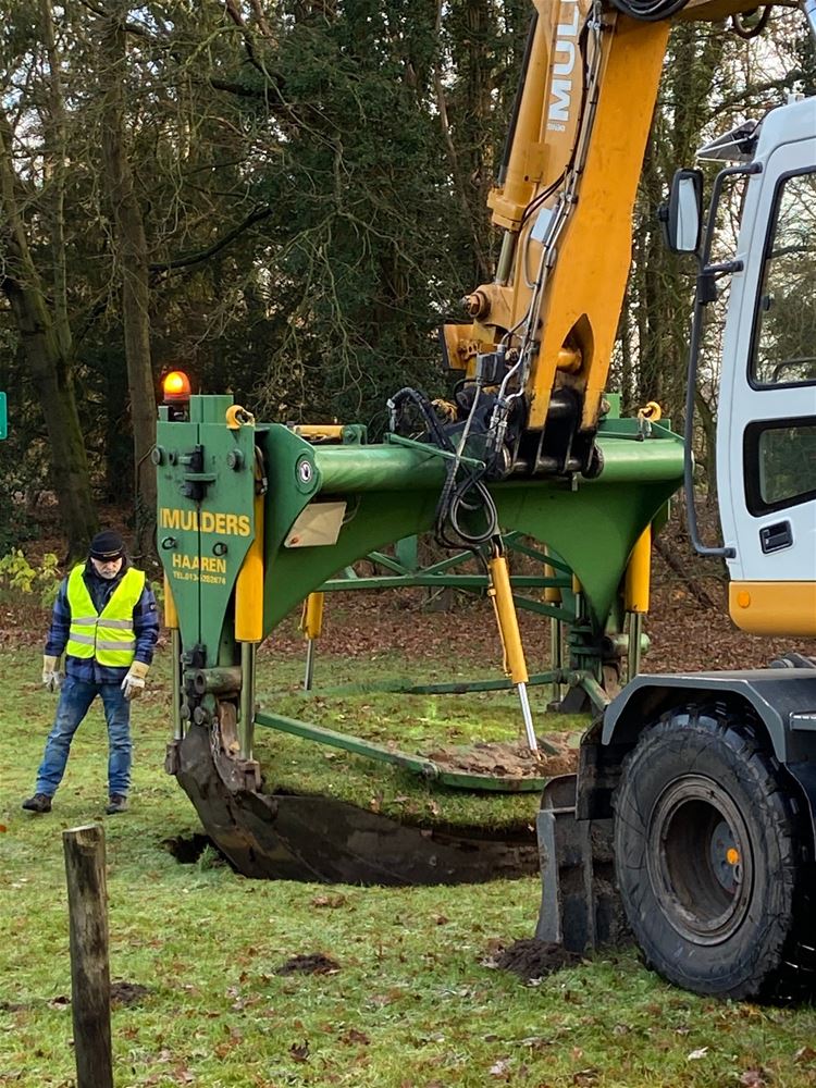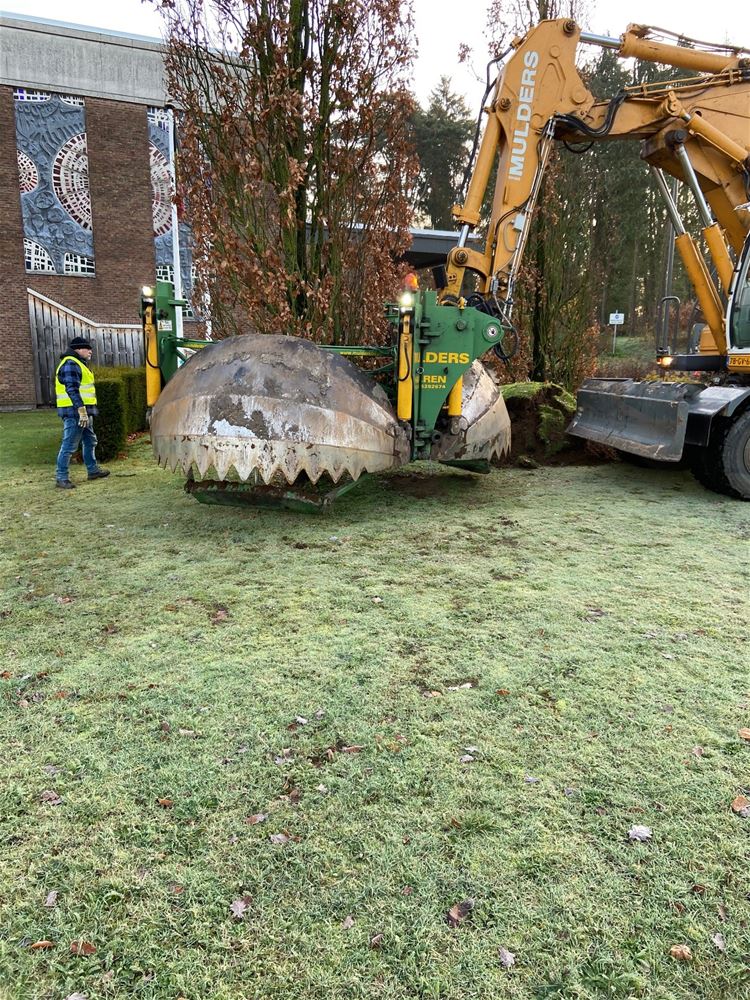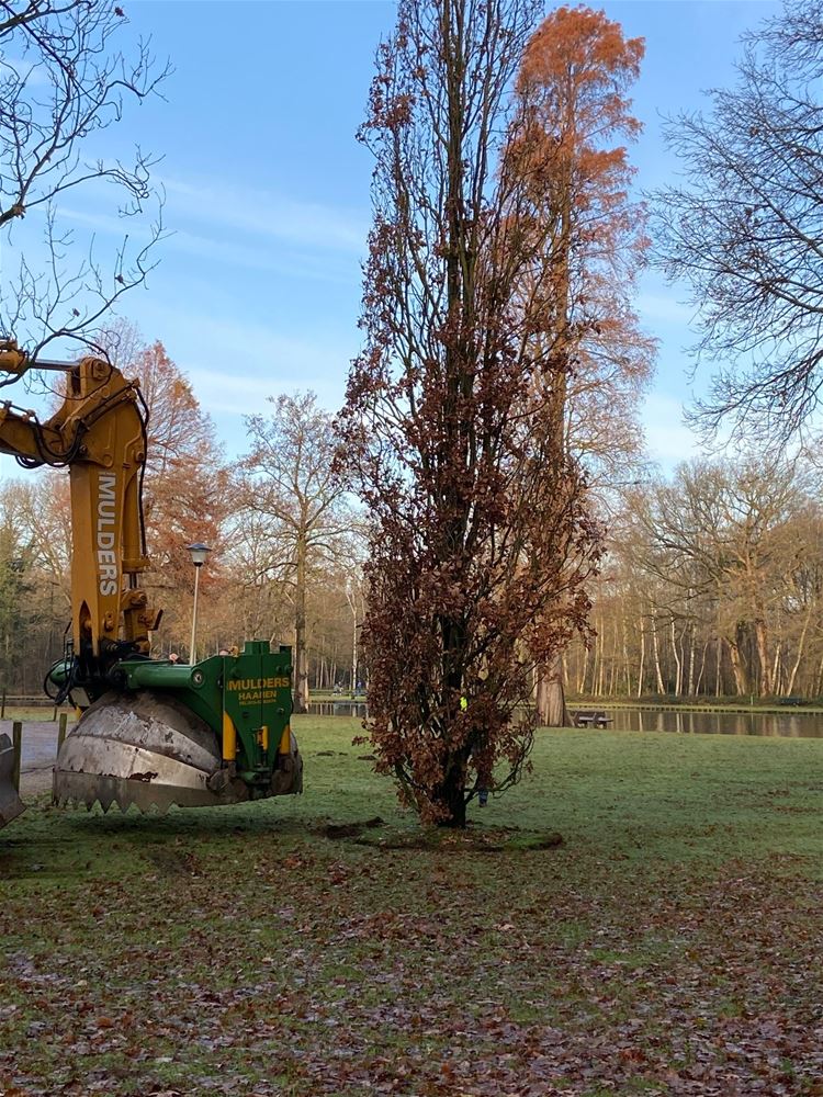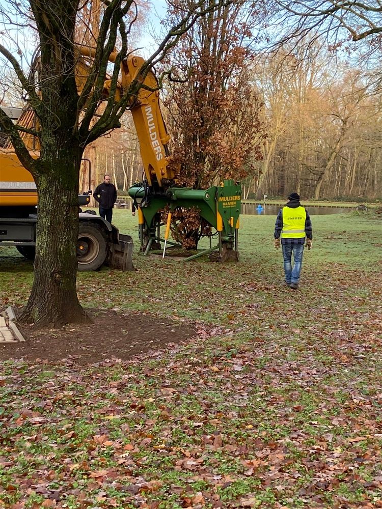 Met een uitgebreide logistieke operatie door een gespecialiseerde firma zijn vanmiddag de 'verbroederingseiken' van de oude Muze overgebracht naar het verbroederingspark aan kasteel Meylandt. De twee eiken waren geschonken door partnerstad Bad Arolsen, naar aanleiding van 25 jaar verbroedering. Ze hadden hun plaats gekregen aan Muze waar ze ondertussen flink uit de kluiten waren gewassen. Maar door de verhuizing van het cultuurcentrum en de nakende sloop van het gebouw, hadden ze daar niet langer een functie. De gemeente heeft ze dan op vraag van het Verbroederingscomité laten overbrengen naar het verbroederingspark op Meylandt. In goed drie uur tijd waren de bomen uitgeplant, overgebracht en opnieuw geplant. (foto's Roger Borgions)50036
