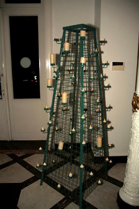 Het Verbroederingscomité hield vanavond een symbolische ontsteking van de kerstboom bij kasteel Meylandt. Die gebeurde voor het eerst zonder de partnersteden en ook zonder elektrische verlichting omwille van de dreigende black-out. Het rotslechte weer weerhield de massa ervan om te komen en zorgde ook dat heel de plechtigheid - dank zij de gastvrijheid van de academie - in de grote zaal van het kasteel plaatsvond. Er waren toespraken van de voorzitter Roger Borgions van het Verbroederingscomité, directeur Walter Missotten van de academie en burgemeester Mario Borremans die ook het eerste lichtje mocht plaatsen. De boom is een schoolproject, volledig gecreëerd door jongeren onder leiding van Jo Dekeyser. Nadat al de gasten hun lichtje in de boom hadden gezet kon iedereen zich warmen aan een kom soep en een jenever. (foto's Roger Borgions)17950