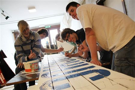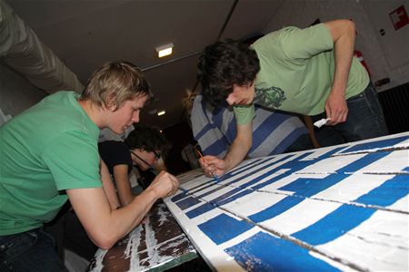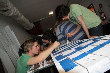 In Muze zijn de voorbereidingen voor het kunstenfestival Circo Paradiso - van 27 tot 29 mei - volop aan de gang. Er wordt getimmerd en geschilderd en daarvoor is het alle hens aan dek. Alle helpende handen zijn dan ook welkom. Zo konden ze deze week al een beroep doen op de asielzoekers van De Bark - die 't Verloren Vissersdorp opbouwden - en een groepje leerlingen van het Sint-Franciscuscollege die in het kader van hun sociale inzetdagen hebben geholpen bij het schilderen van signalisatieborden en andere spullen. (foto's Gert Dehasque)