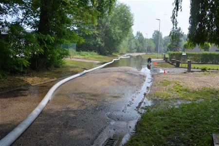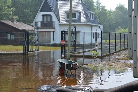 De inzet van de zware debietpomp die 24 uur per dag draait in de Ambachtlaan, begint zijn vruchten af te werpen. Door het massaal wegpompen van het water, is het peil nu sterk gedaald. Ook de achteraan gelegen woning komt nu stilaan vrij, de andere huizen liggen zo goed als droog. Het is nu hopen dat er geen nieuwe zware regenval bijkomt. Vanmiddag is wel een brandweerploeg van Heusden-Zolder naar Lummen uitgerukt waar een nieuwe dijkbreuk in de Demer was ontstaan. (foto's Michiel Reynders)27540