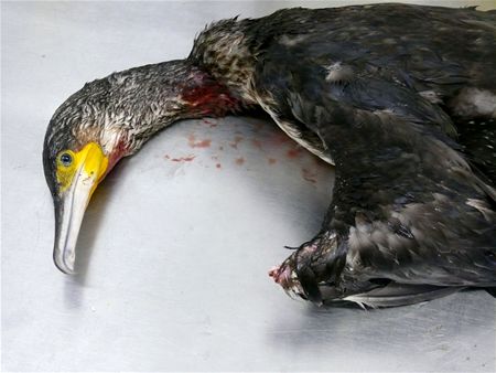 Deze week heeft het Vogel- en Zoogdierenopvangcentrum drie keer watervogels moeten bevrijden aan de vijvers in het gebied De Wijers. Op sommige vijvers is nog een viskweker actief en die probeert zijn vissen te beschermen tegen hongerige vogels met een groot raster van nylon draden. Die zijn haast onzichtbaar voor aanvliegende vogels en vormen zo een dodelijke val. Maandag kon een kokmeeuw gered worden, ze moet enkele weken van haar wonden herstellen. Woensdag onderging een kolgans hetzelfde lot, ook daar liep het vrij goed af. En vandaag was een aalscholver met zijn vleugel vastgeraakt. De vogel was zo in paniek dat hij in de snijdende nylondraad zijn eigen vleugel amputeerde en doodbloedde. Het opvangcentrum kant zich al jaren tegen de draden en wil de zaak nu opnieuw aankaarten bij het Agentschap Natuur en Bos en Vogelbescherming Vlaanderen.12848
