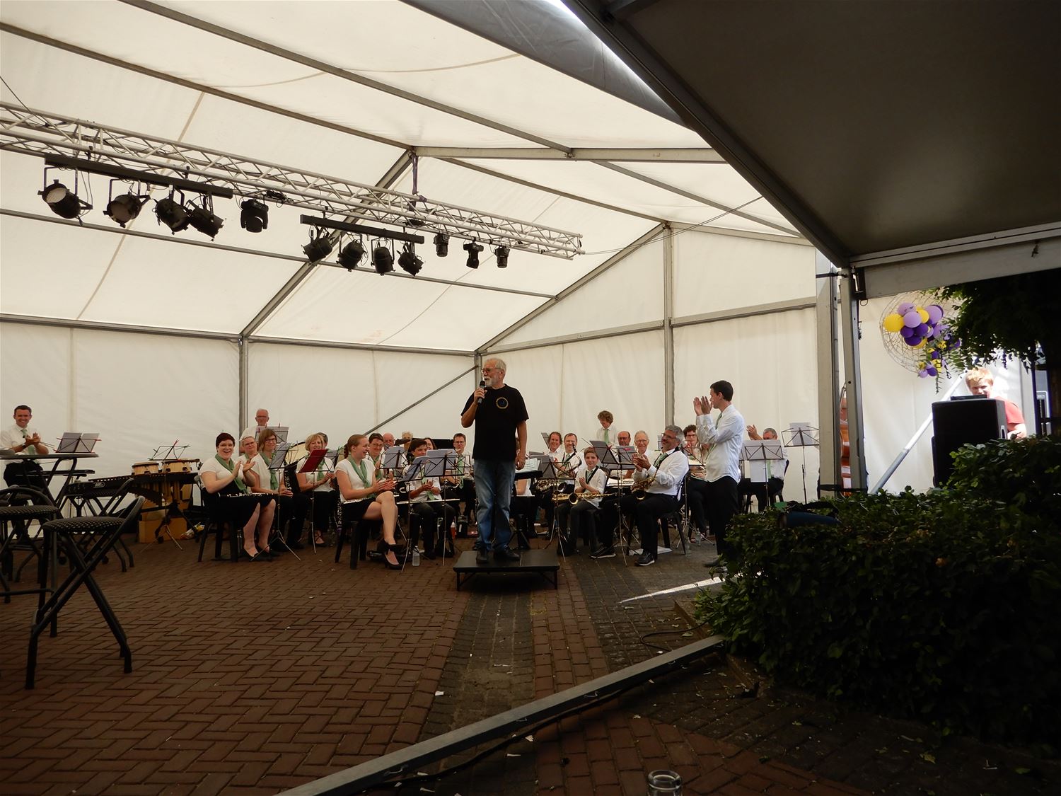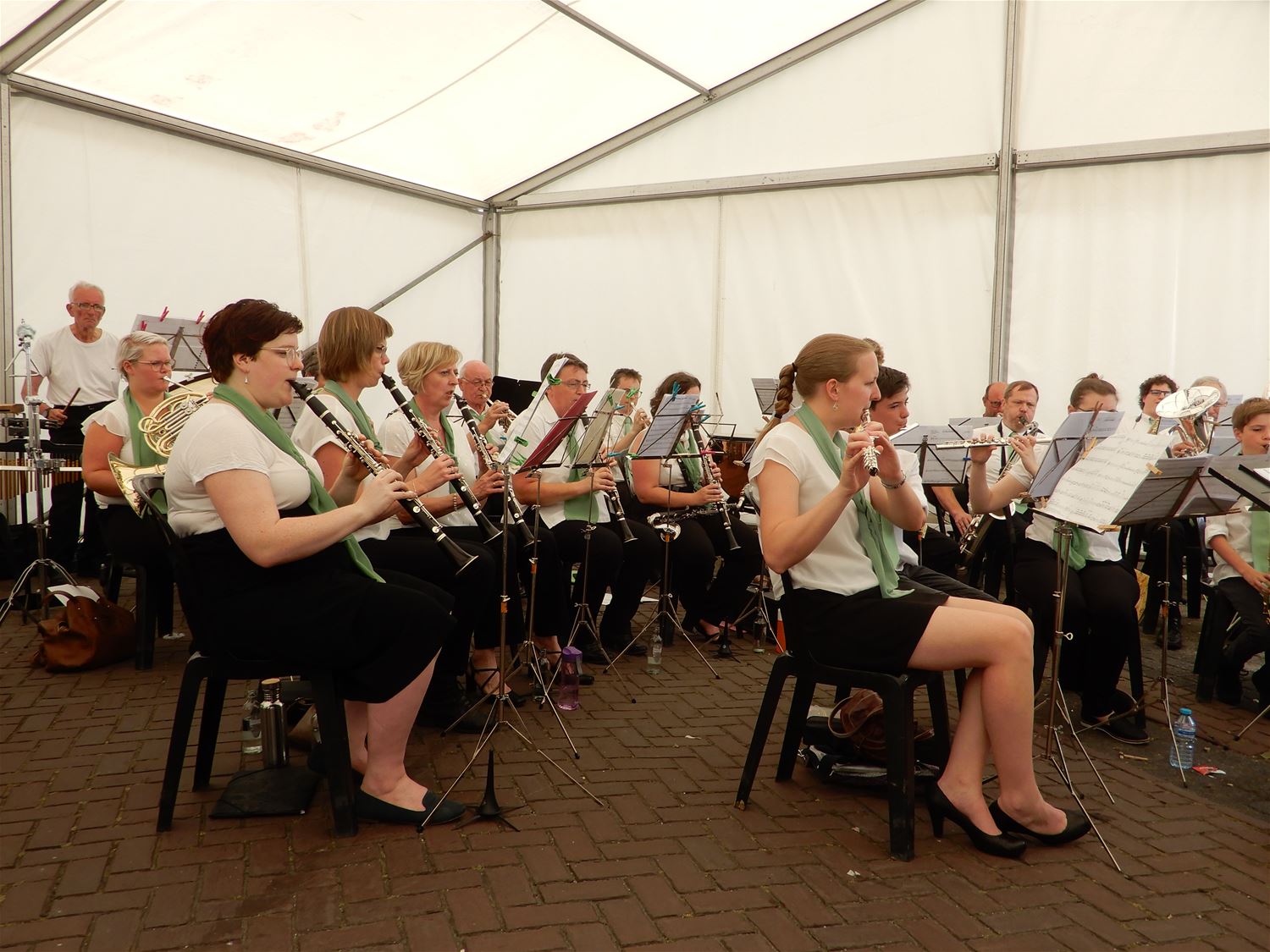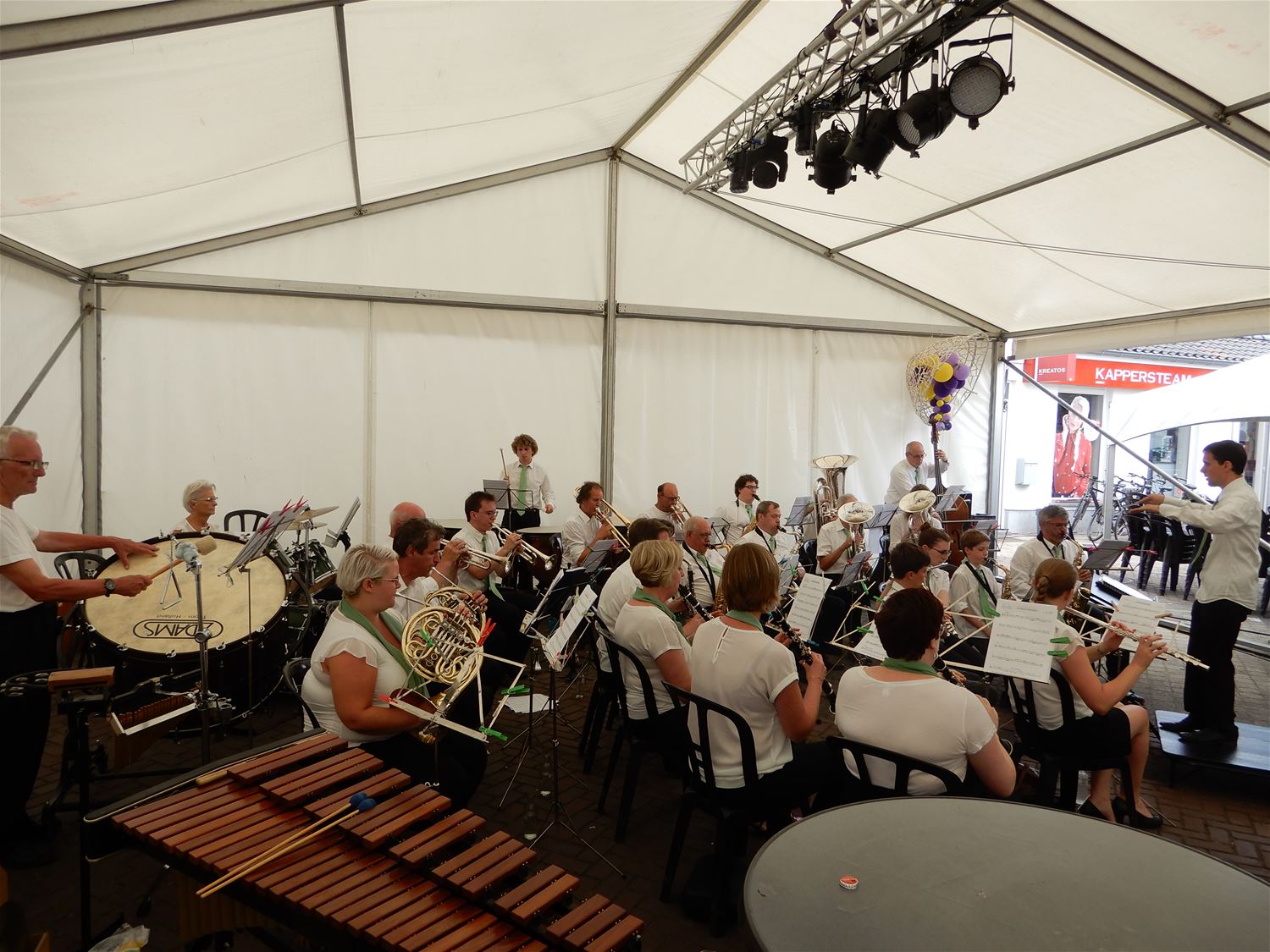 De Koninklijke Harmonie De Verenigde Vrienden gaf vroeg na de middag een aperitiefconcert naar aanleiding van de kermis. De harmonie had een stevig programma ingeoefend en gaf een kwalitatief hoogstaand concert. Jammer dat bij deze zomerse omstandigheden maar een 20-tal toehoorders opdaagde. De reuzen luisterden mee en trokken nadien naar het wielerpodium. 47286