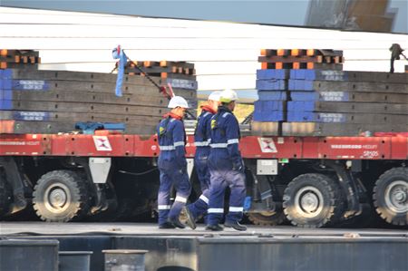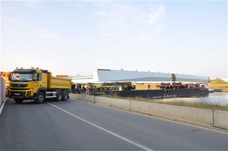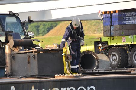 Al sinds de prille ochtend zijn personeelsleden van verschillende firma's en nv De Scheepvaart aan de slag op en rond het kanaal in Viversel. Het ponton met de reusachtige bodemplaat voor de tijdelijke brug ligt dwars over het kanaal. Het is op vier plaatsen verankerd, aan één kaaipaal en met drie vrachtwagens, verspreid over beide oevers. Alles wordt deze ochtend in gereedheid gebracht om dan straks het element te lossen. Ondertussen ligt de scheepvaart stil, al gaat het in dat geval vandaag over wat plezierbootjes.28061