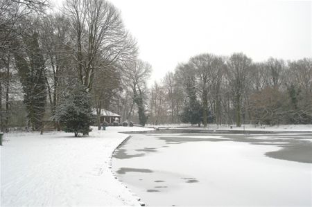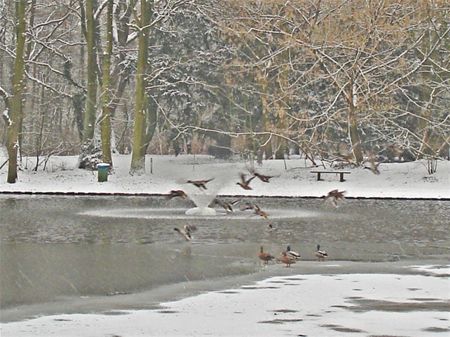 Ijs op het water, ondersneeuwde natuur, maar de eendjes lijken zich te pletter te amuseren op Meylandt. (foto's René Bosmans)6392