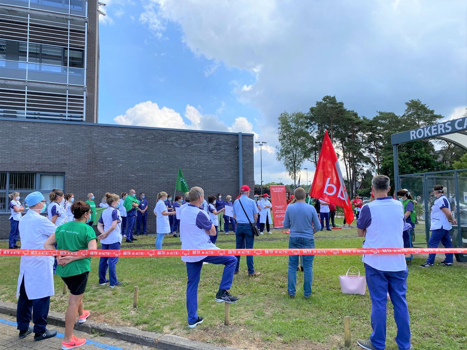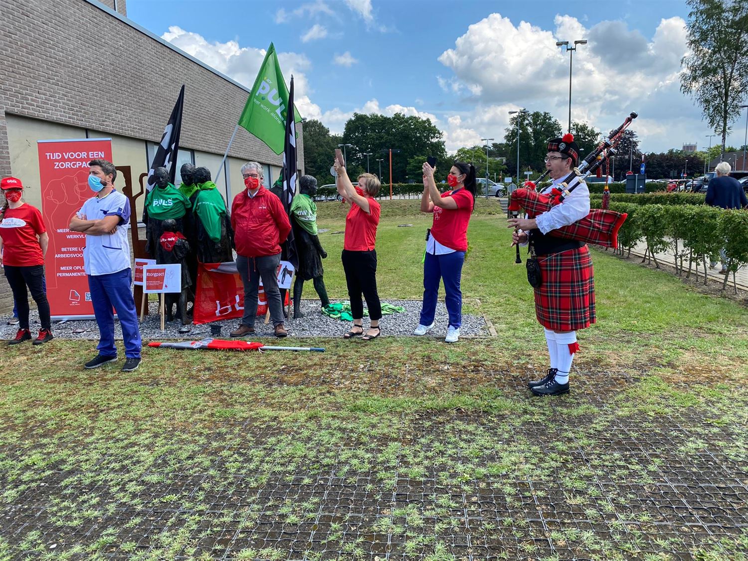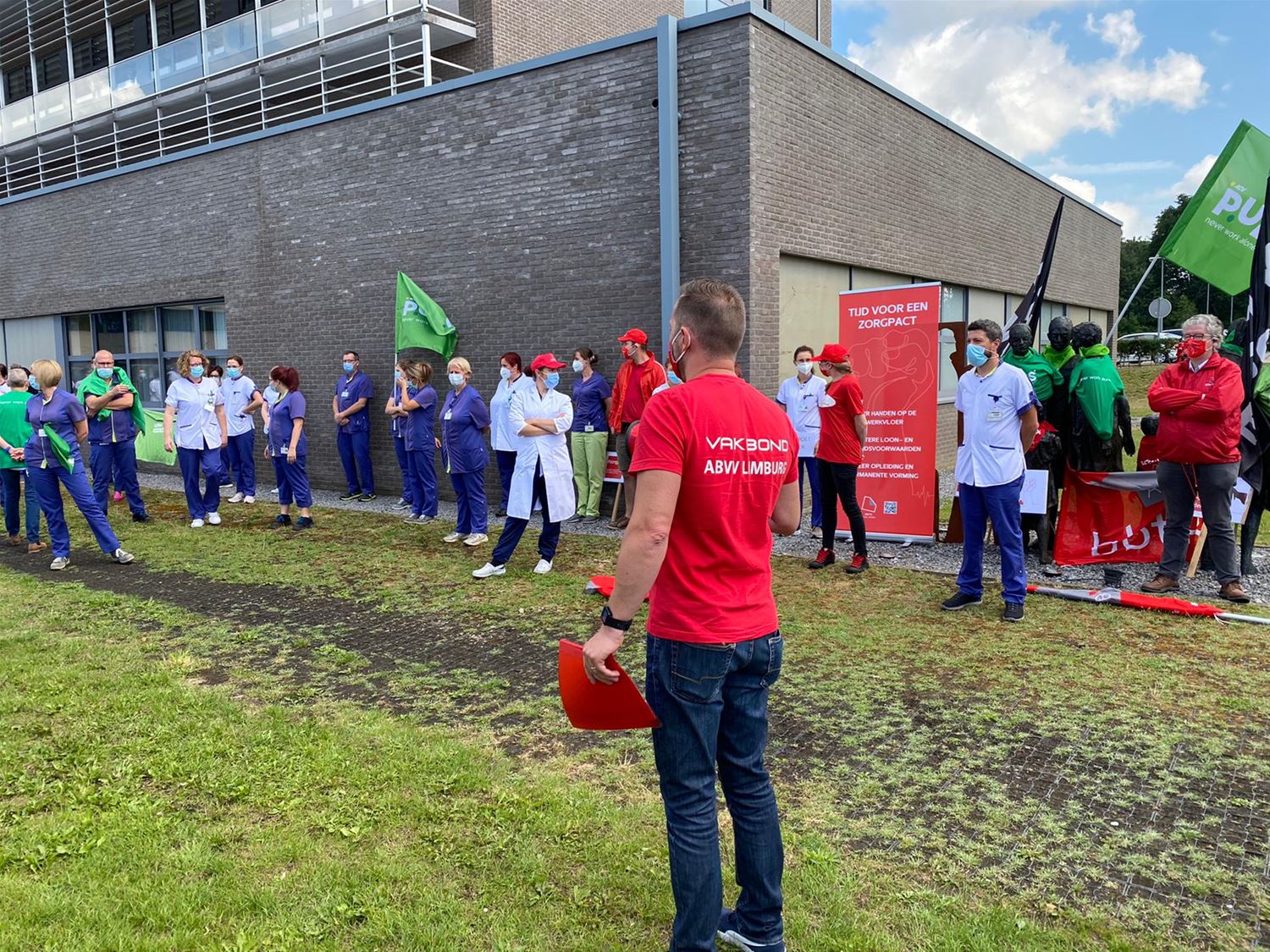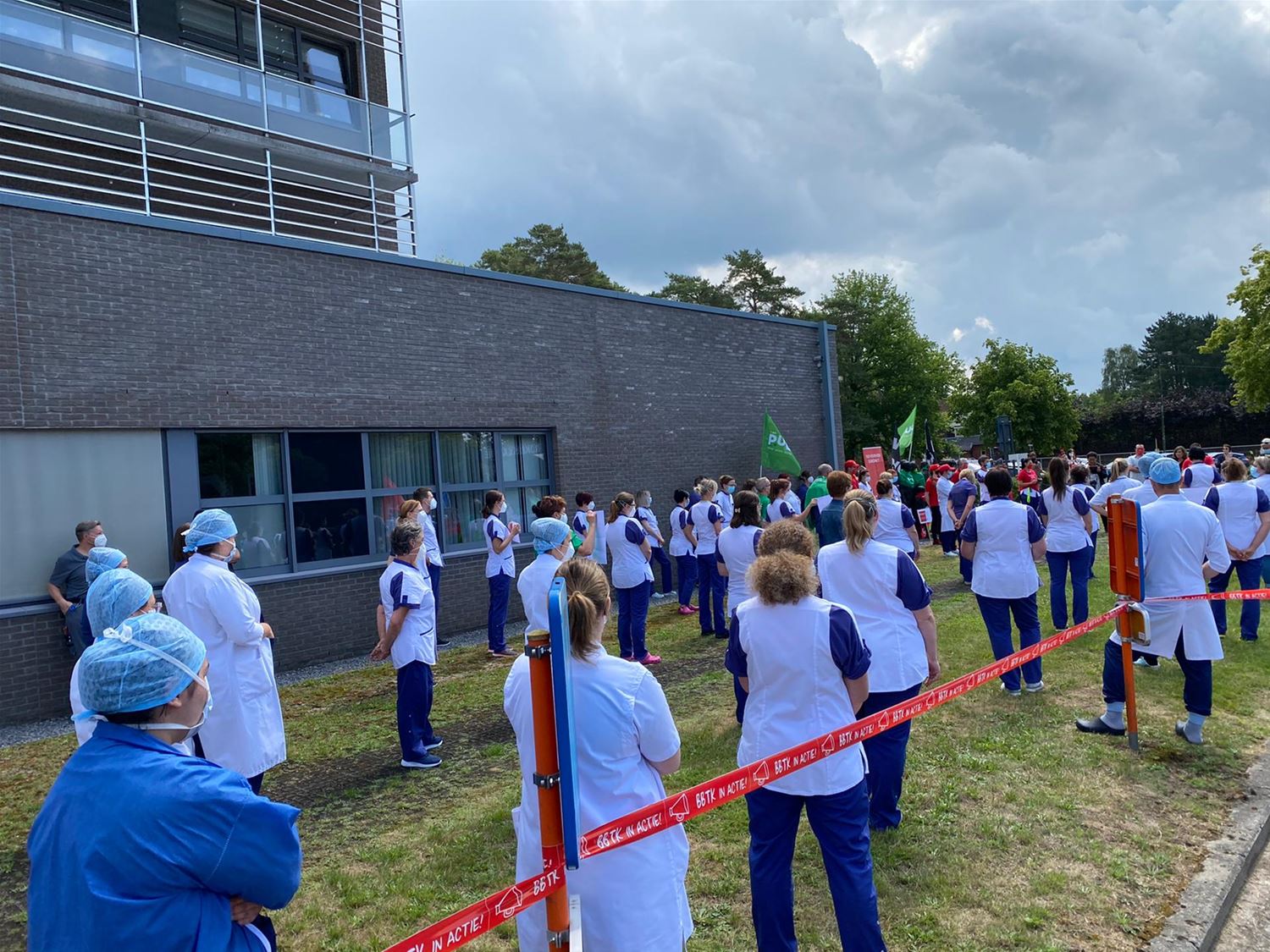 Het personeel van het Sint-Franciscusziekenhuis is vanmiddag om 5 voor 12 massaal naar buitengekomen op initiatief van de christelijke en socialistische vakbonden. Tegelijk vonden gelijkaardige initiatieven plaats elders in Vlaanderen. Ze eisen een pact voor de non-profit. In volle coronacrisis kreeg het zorgpersoneel massaal applaus en complimentjes. Maar in een pact vragen ze ook meer loon voor iedereen, aantrekkelijke arbeidsvoorwaarden, minder werkdruk en meer personeel op de werkvloer en geen besparingen maar investeringen. De actie duurde maar heel kort en er werd de nodige afstand gehouden, en met een doedelzakspeler kreeg ze een beetje een ludiek karakter. Maar de vastberadenheid is daarom niet minder. (foto's Michiel Reynders)