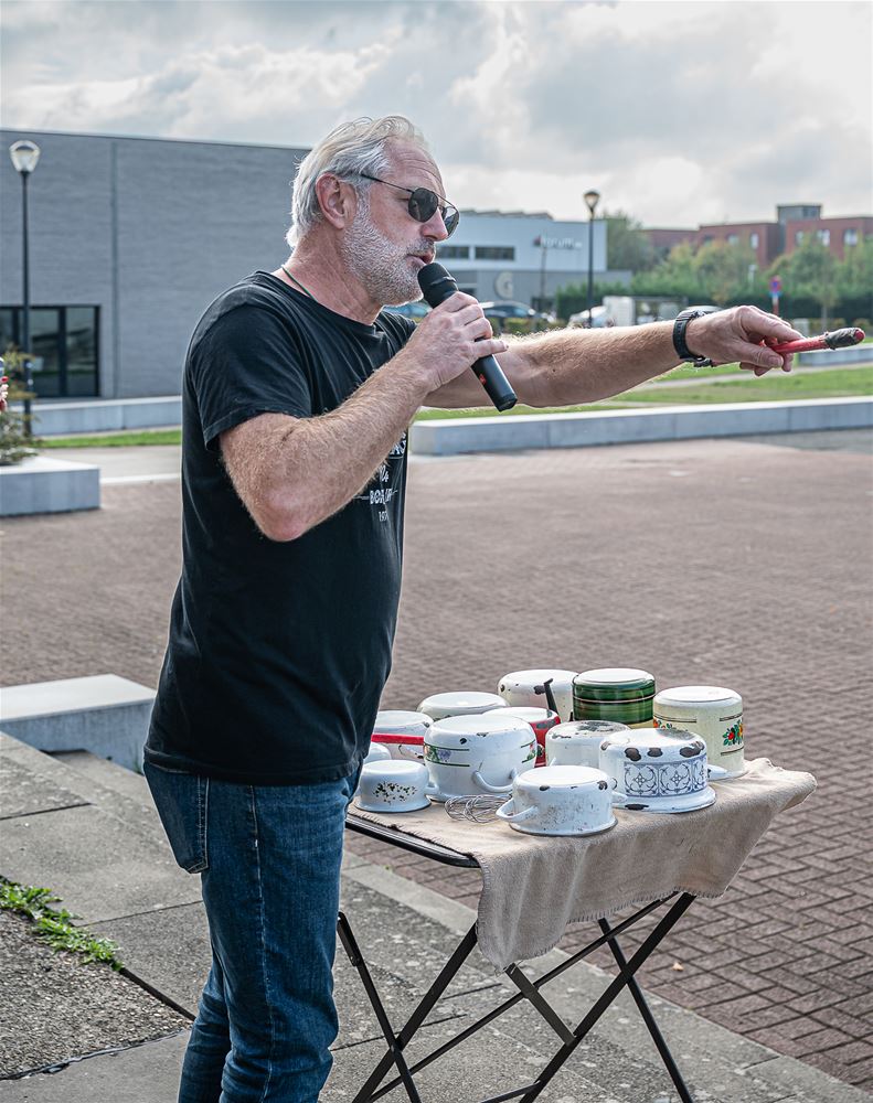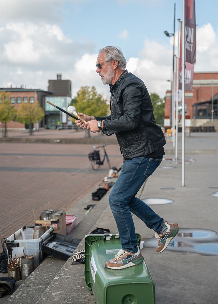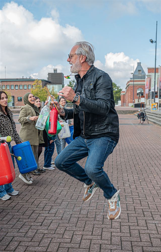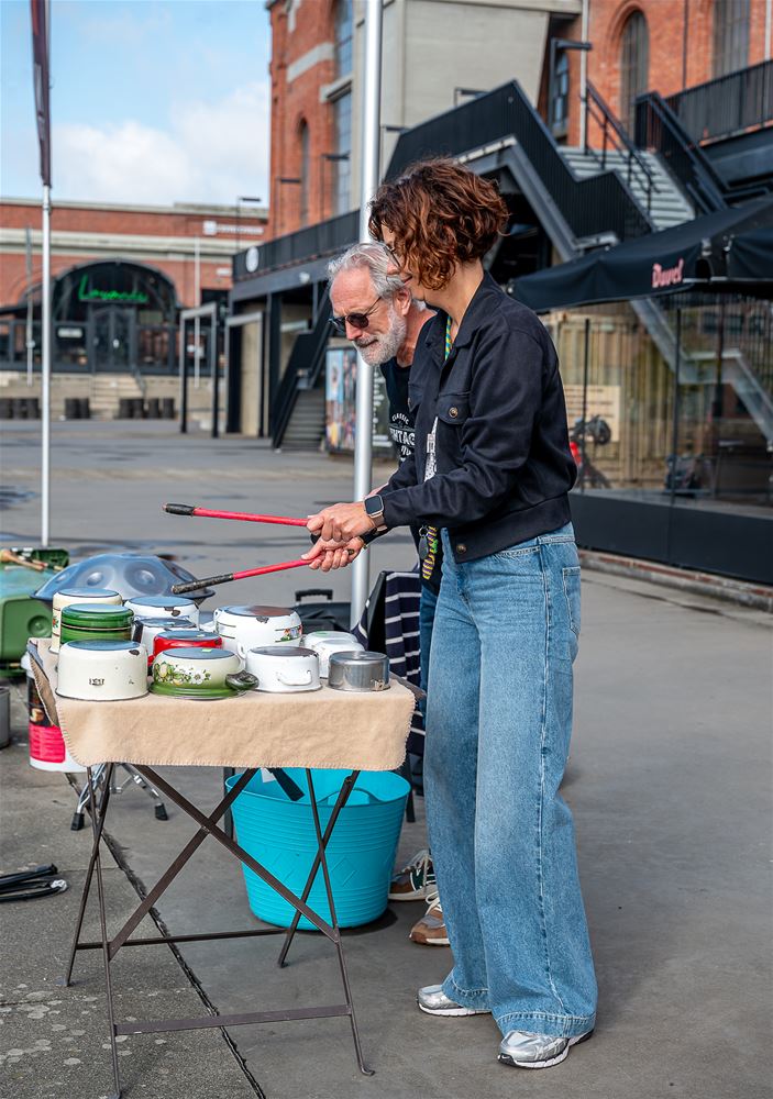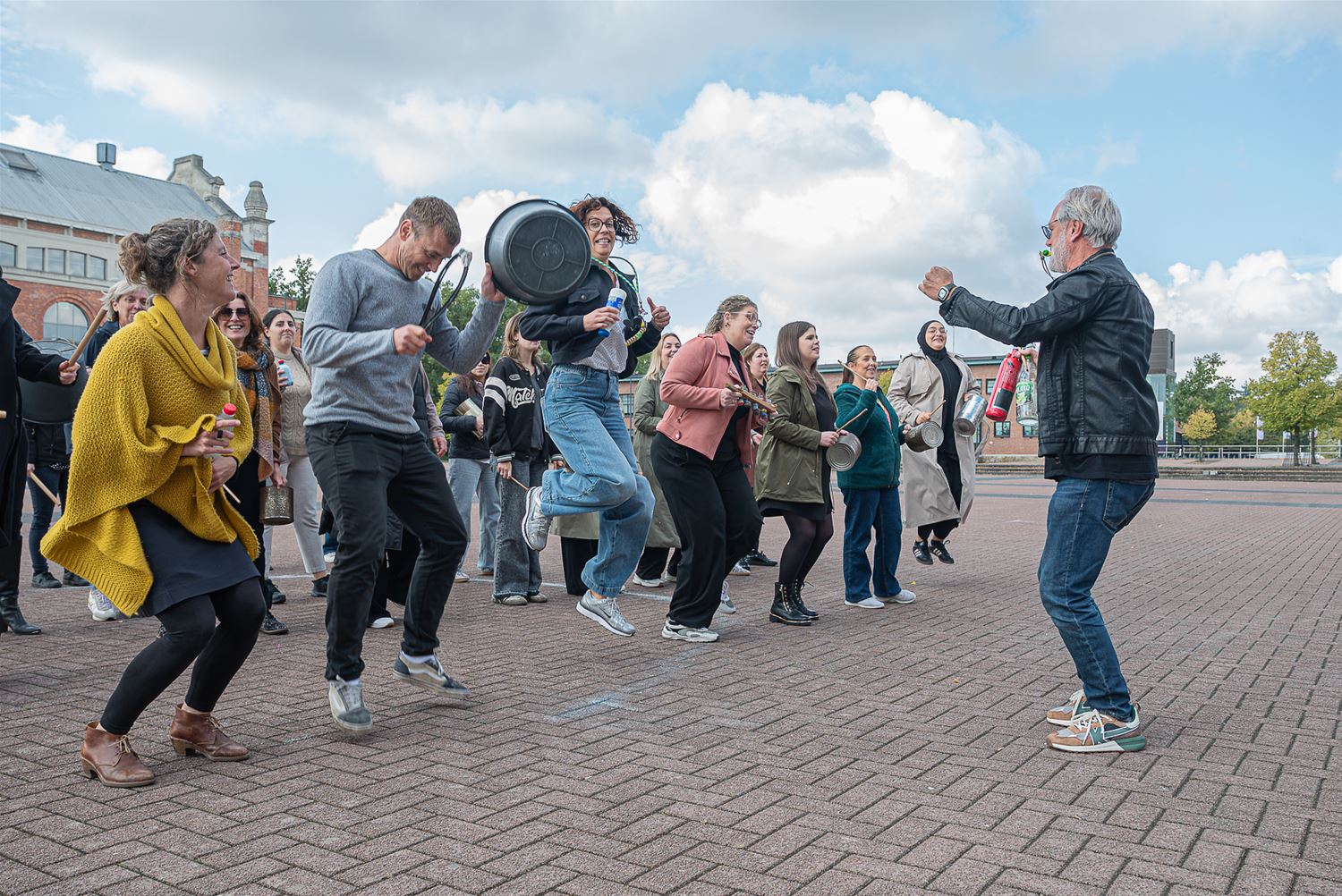 Kinderbegeleid(st)ers kunnen behoorlijk wat tamtam maken. Dat hebben ze vanmiddag bewezen op het Marktplein. Tijdens de Week van de Kinderopvang lieten ze zich horen tijdens een percussieworkshop. Met luide trom maakten ze duidelijk dat hun beroep belangrijk is voor de samenleving. Bart Braeken leerde hen tijdens de workshop hoe zij op hun beurt met eenvoudige materialen percussie kunnen aanleren bij kinderen. Maar eerst moesten ze uiteraard zelf percussie onder de knie krijgen. Dus werd er getrommeld, gedanst, gesprongen en vooral veel gelachen. En Bart verbaasde met indrukwekkende solo’s op een vuilbak, potten en pannen. (foto’s Roman Martyka)