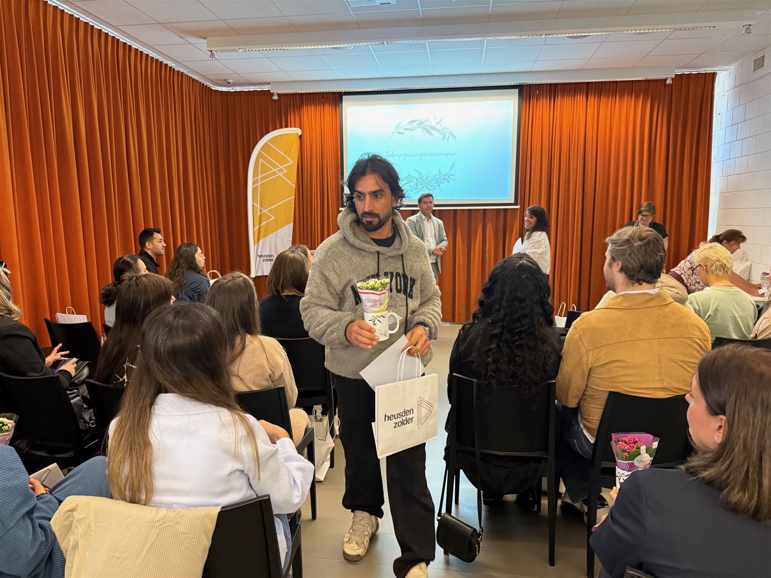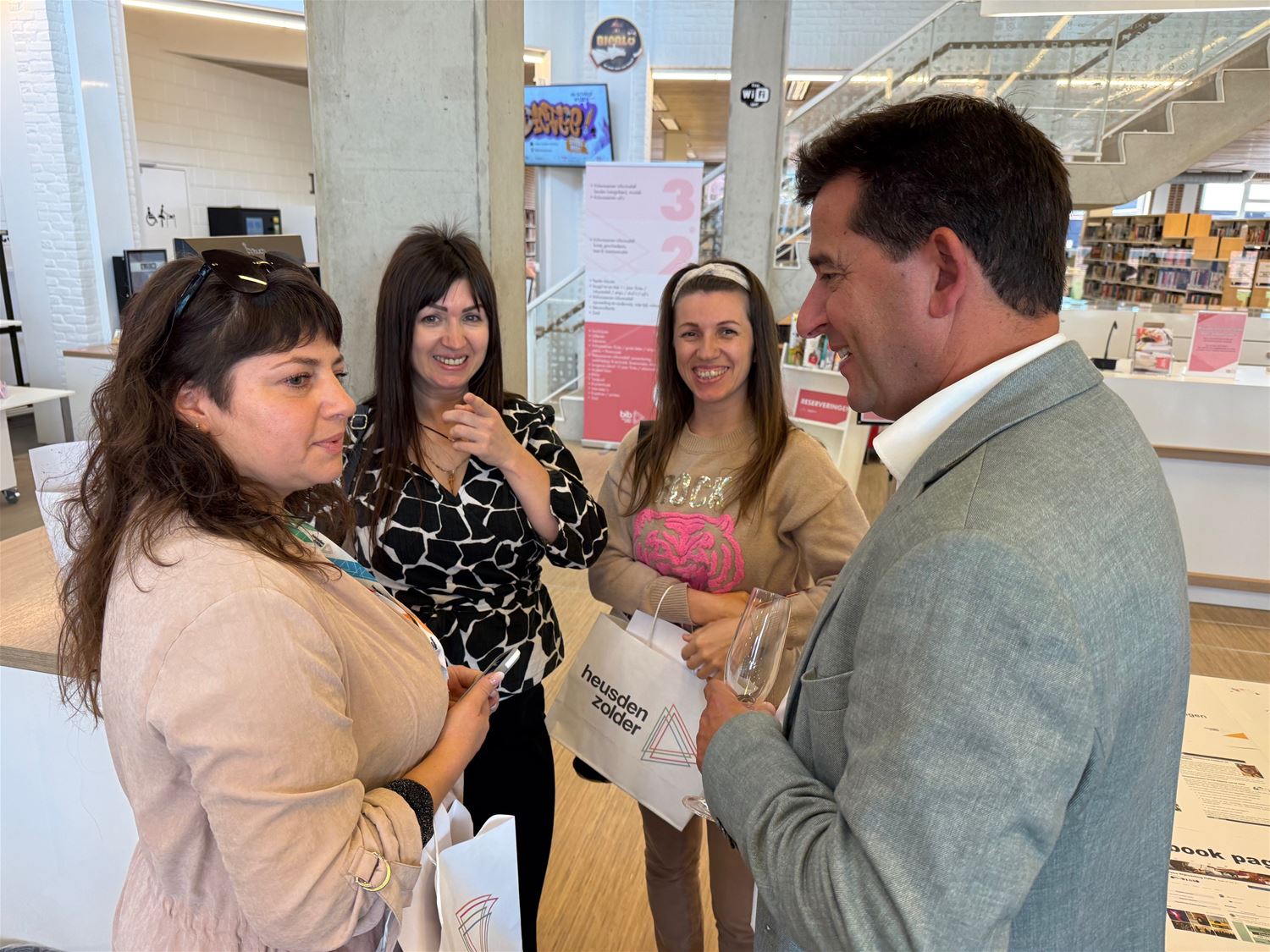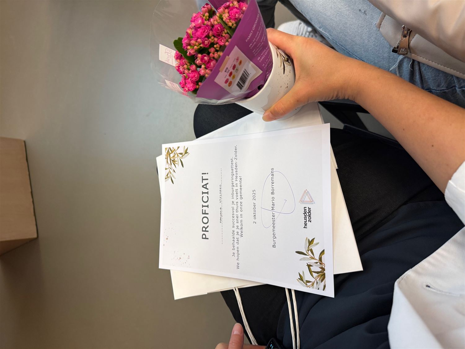 In de bibliotheek hebben vandaag 27 mensen hun certificaat in ontvangst genomen nadat ze hun inburgeringsattest behaalden bij het Agentschap Integratie en Inburgering. Niet alle nieuwkomers die de lessen gevolgd hadden waren aanwezig, in het totaal namen 52 mensen uit alle windstreken deel. Ze kregen onder meer felicaties van schepen Steven Goris en burgemeester Mario Borremans. Niet toevallig werden de certificaten uitgereikt bij het begin van de Week van het Nederlands. Daarom had aansluitend ook een talenmarkt plaats waar allerlei organisaties zich voorstelden bij wie de nieuwkomers kunnen aankloppen. Van de gemeente Heusden-Zolder kregen ze een promotasje en een bloemetje. (foto’s Julien Maebe)
