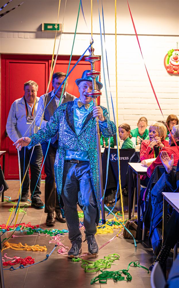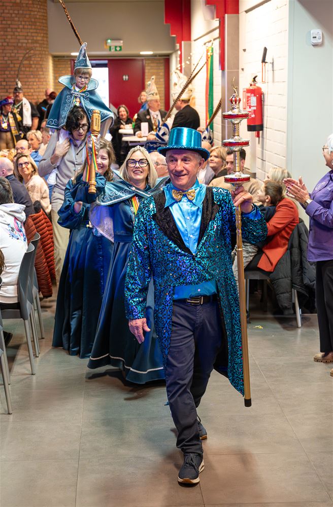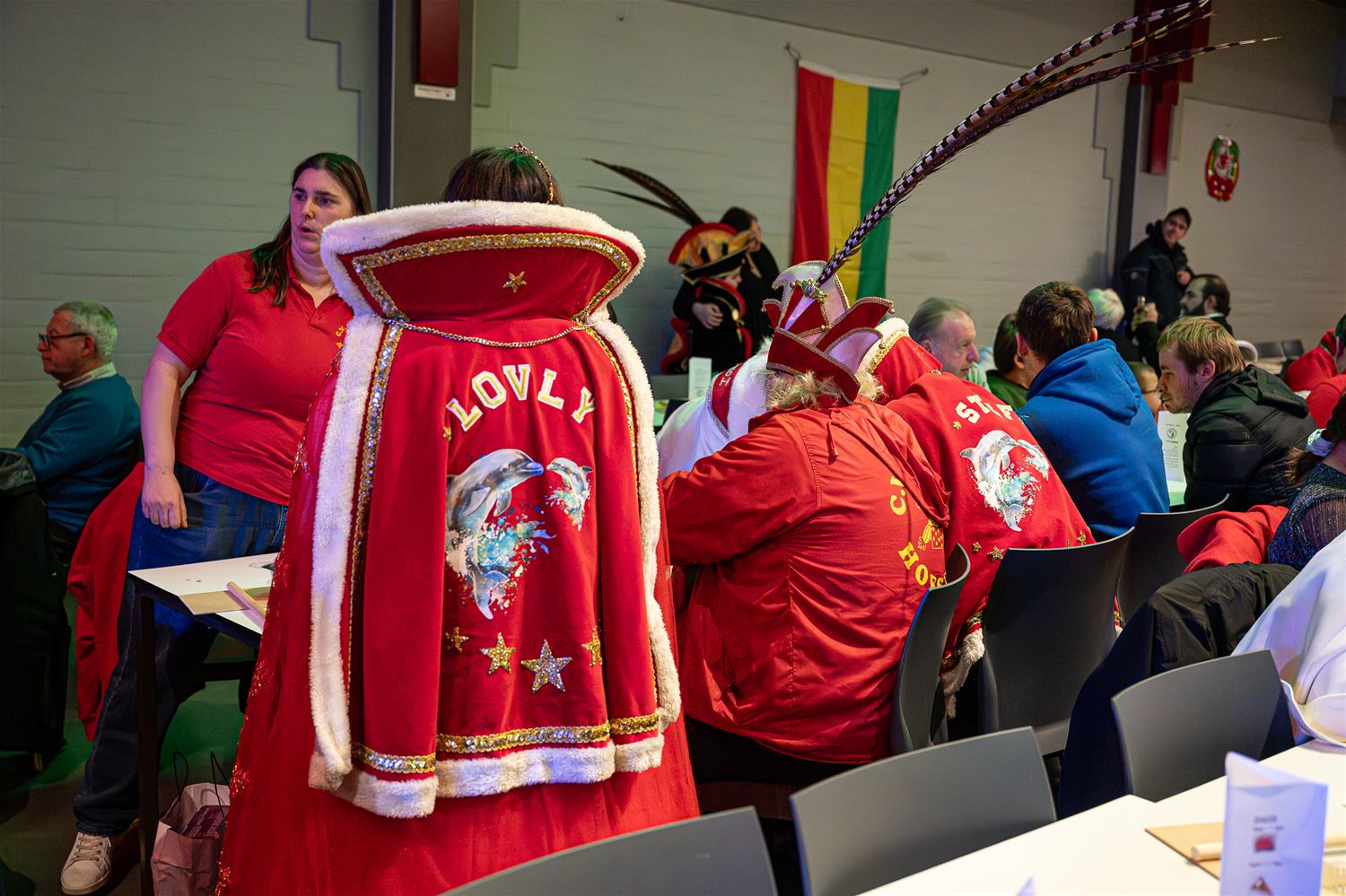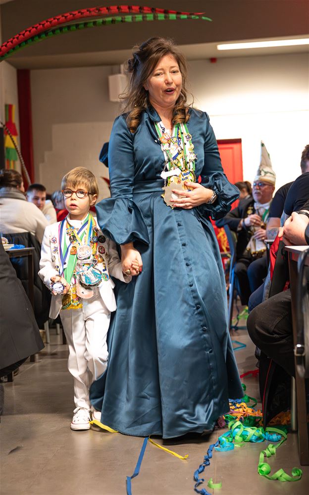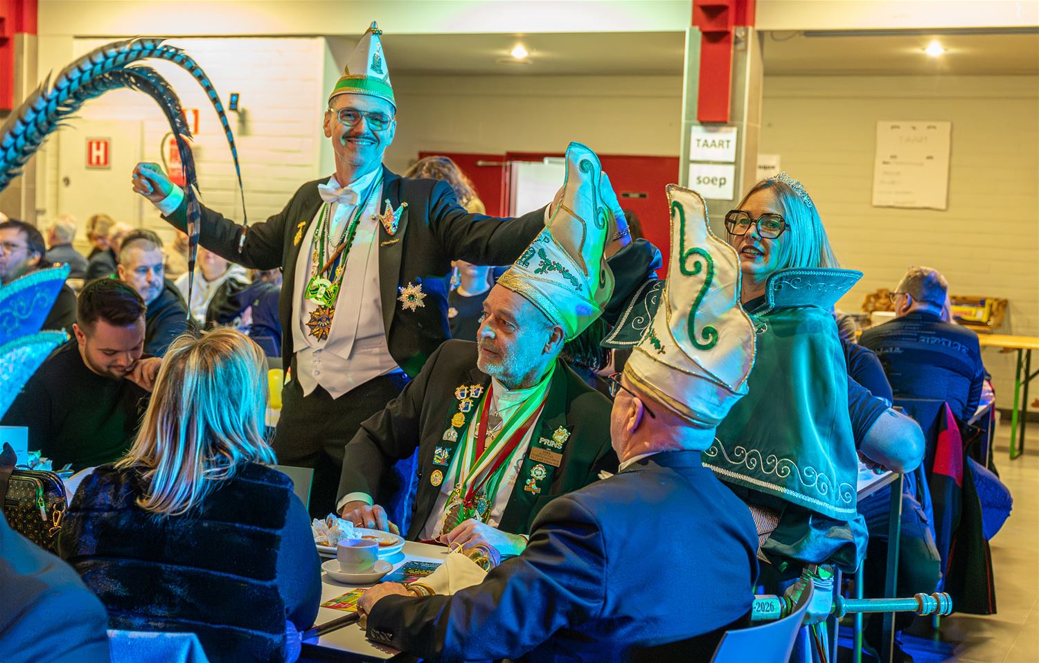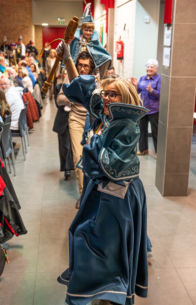 In een afgeladen vol Kuipershof hielden De Slamridders vandaag hun ontbijtshow. De sfeer zat er volop in, mede ook door de artiesten die er een flinke lap op gaven en door de onverbeterlijke animator Jean-Paul Klinkers. Eerst werd afscheid genomen van het regerende trio: prinses An, hofdame Liesbeth en jeugdprins Lewis. Daarna werden met de nodige stunts en truuks en de hulp van burgemeester Mario Borremans de nieuwe gezagsdragers van De Slamridders bekendgemaakt en het gaat deze keer om een uitgebreid gezelschap. Eddy I is de nieuwe prins, Senna I de nieuwe prinses en Gitte I de jeugdprinses. Zij krijgen bij hun drukke programma de assistentie van hofdame Nadien en adjudant Kay. De ambiance en de polonaises vandaag in ’t Kuipershof doen alvast het beste hopen voor de rest van het carnavalseizoen. (foto’s Roman Martyka)