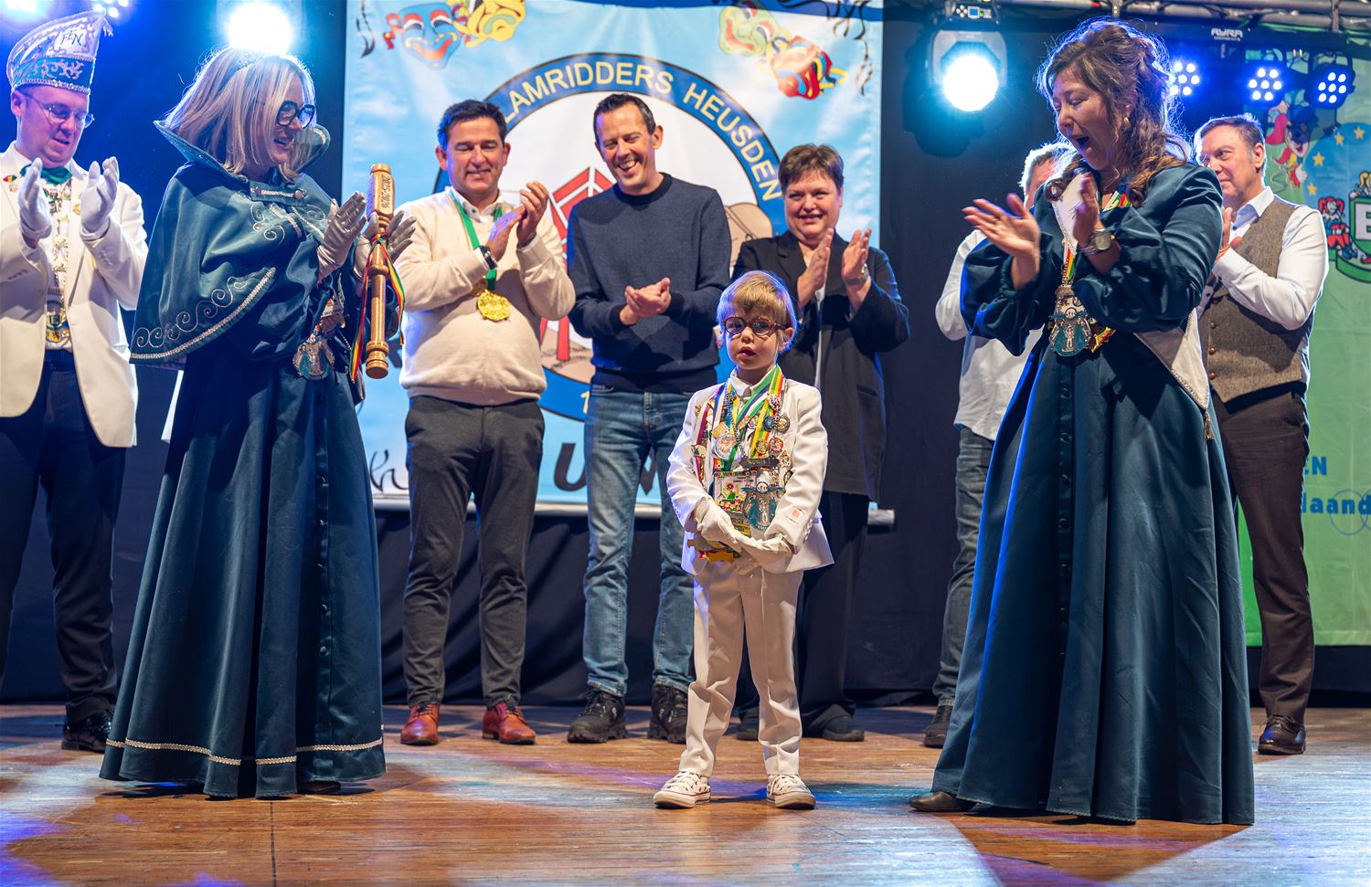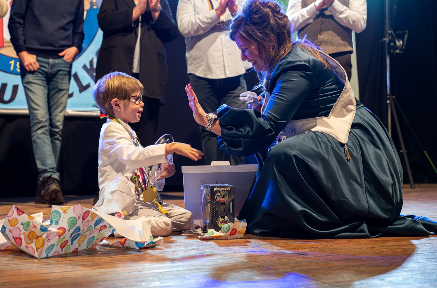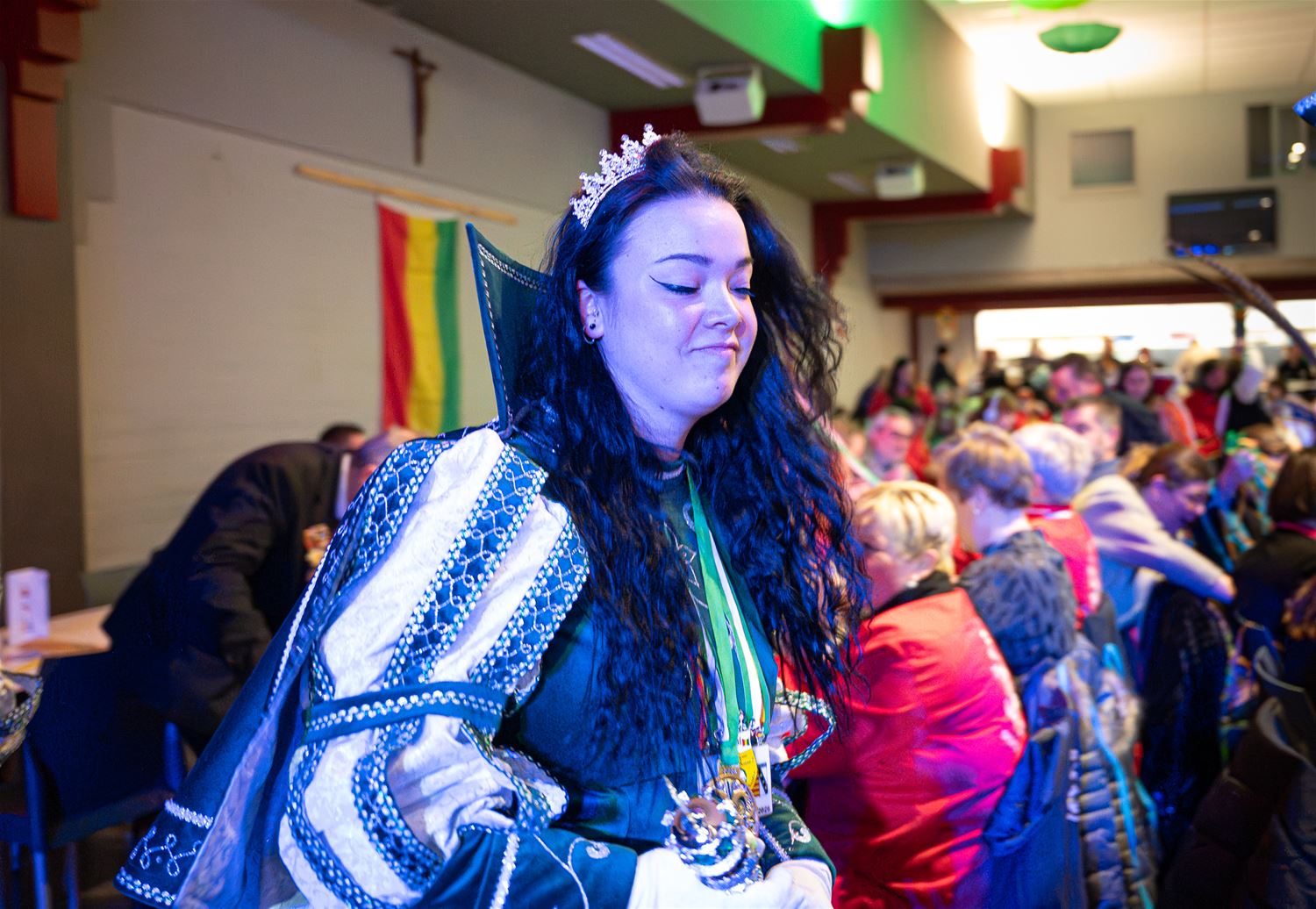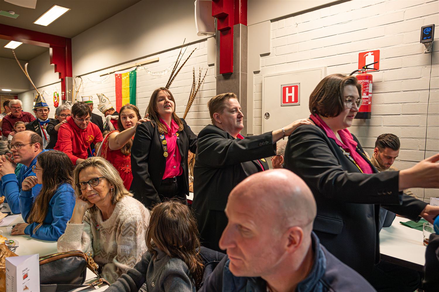 In een afgeladen vol Kuipershof hielden De Slamridders vandaag hun ontbijtshow. De sfeer zat er volop in, mede ook door de artiesten die er een flinke lap op gaven en door de onverbeterlijke animator Jean-Paul Klinkers. Eerst werd afscheid genomen van het regerende trio: prinses An, hofdame Liesbeth en jeugdprins Lewis. Daarna werden met de nodige stunts en truuks en de hulp van burgemeester Mario Borremans de nieuwe gezagsdragers van De Slamridders bekendgemaakt en het gaat deze keer om een uitgebreid gezelschap. Eddy I is de nieuwe prins, Senna I de nieuwe prinses en Gitte I de jeugdprinses. Zij krijgen bij hun drukke programma de assistentie van hofdame Nadien en adjudant Kay. De ambiance en de polonaises vandaag in ’t Kuipershof doen alvast het beste hopen voor de rest van het carnavalseizoen. (foto’s Roman Martyka)