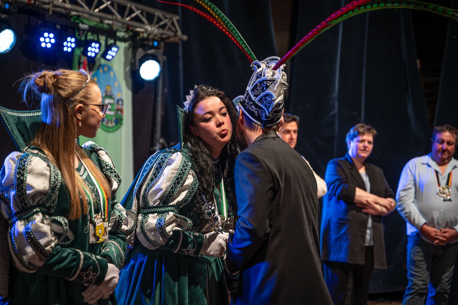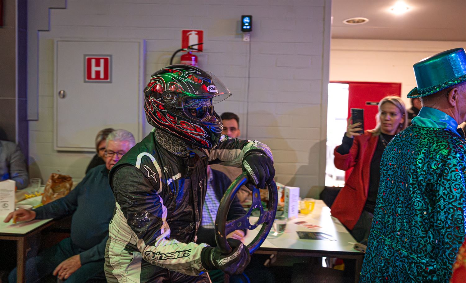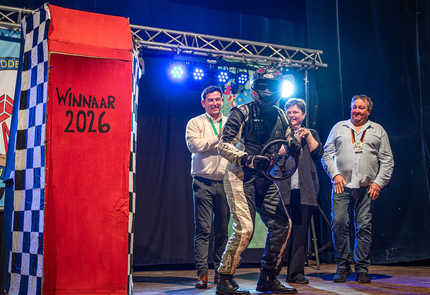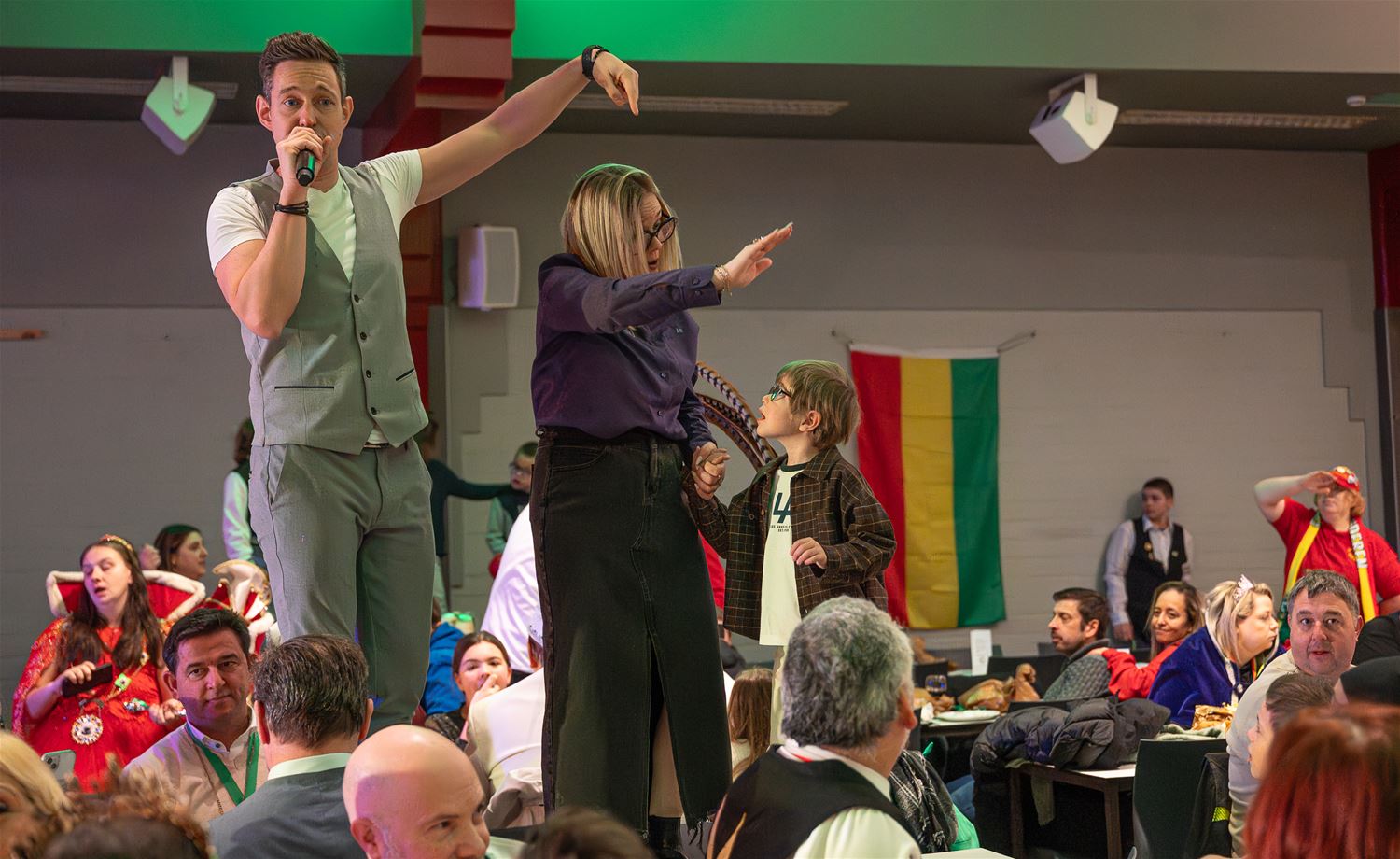 In een afgeladen vol Kuipershof hielden De Slamridders vandaag hun ontbijtshow. De sfeer zat er volop in, mede ook door de artiesten die er een flinke lap op gaven en door de onverbeterlijke animator Jean-Paul Klinkers. Eerst werd afscheid genomen van het regerende trio: prinses An, hofdame Liesbeth en jeugdprins Lewis. Daarna werden met de nodige stunts en truuks en de hulp van burgemeester Mario Borremans de nieuwe gezagsdragers van De Slamridders bekendgemaakt en het gaat deze keer om een uitgebreid gezelschap. Eddy I is de nieuwe prins, Senna I de nieuwe prinses en Gitte I de jeugdprinses. Zij krijgen bij hun drukke programma de assistentie van hofdame Nadien en adjudant Kay. De ambiance en de polonaises vandaag in ’t Kuipershof doen alvast het beste hopen voor de rest van het carnavalseizoen. (foto’s Roman Martyka)