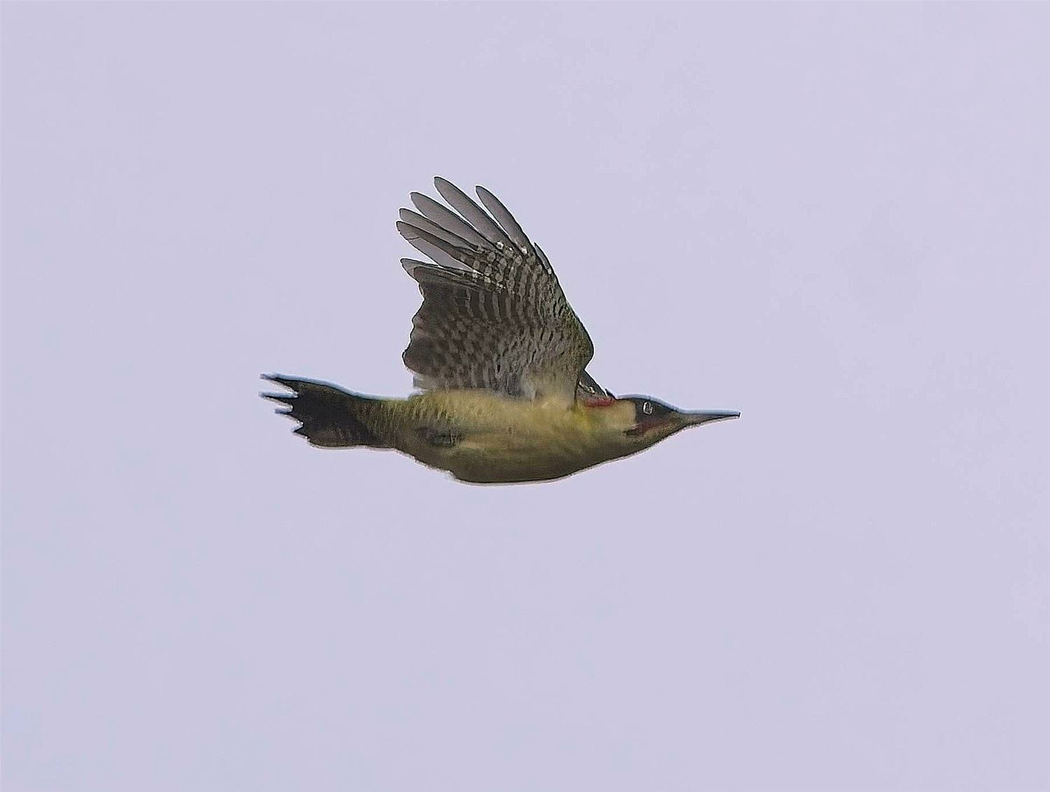 Aan de mijnterril kon Johan Put vandaag deze groene specht in de vlucht onderscheppen. Zo’n groene specht vliegt in een golvende beweging terwijl hij meestal een luid en scherp "klu klu" roept.
