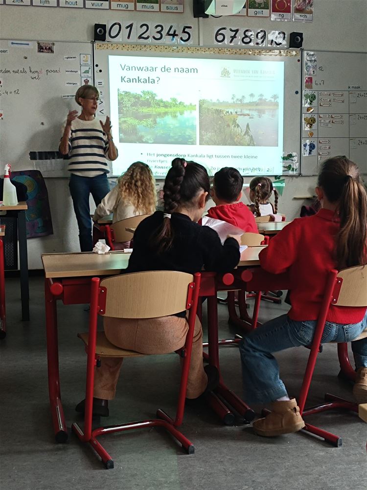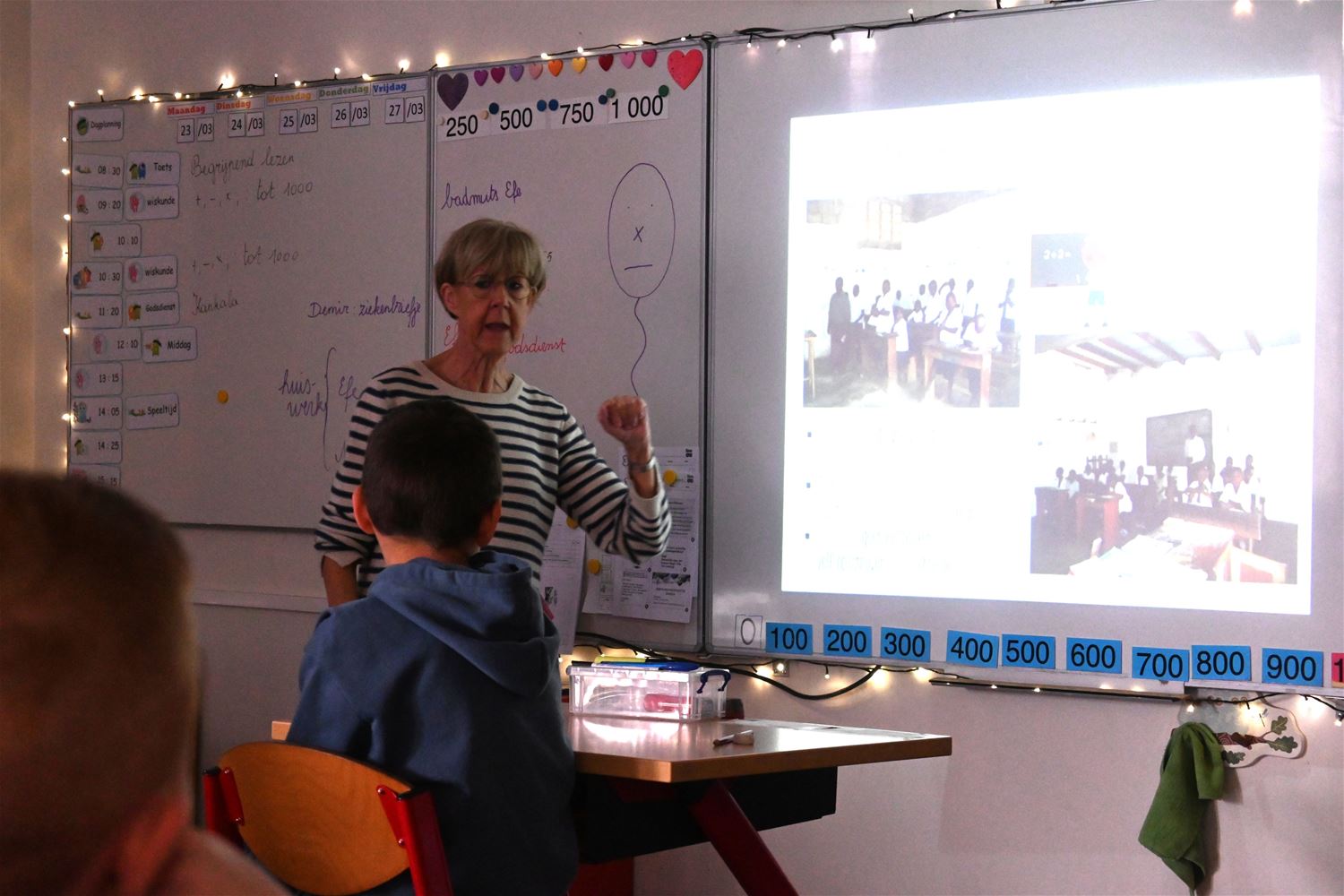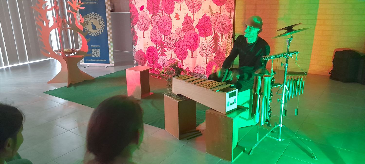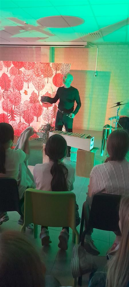 De afgelopen weken liep in de bibliotheek de kleurrijke tentoonstelling ‘Jungle’ met werken van 125 klassen. De bezoekers konden stemmen voor hun favoriete kunstwerkje. 'Vliegende Olifant', gemaakt door de leerlingen van 5A van 't Molenholleke, kreeg erg veel stemmen en daarom was er vandaag als beloning een muzikale activiteit voor de klas van juf Chiara.