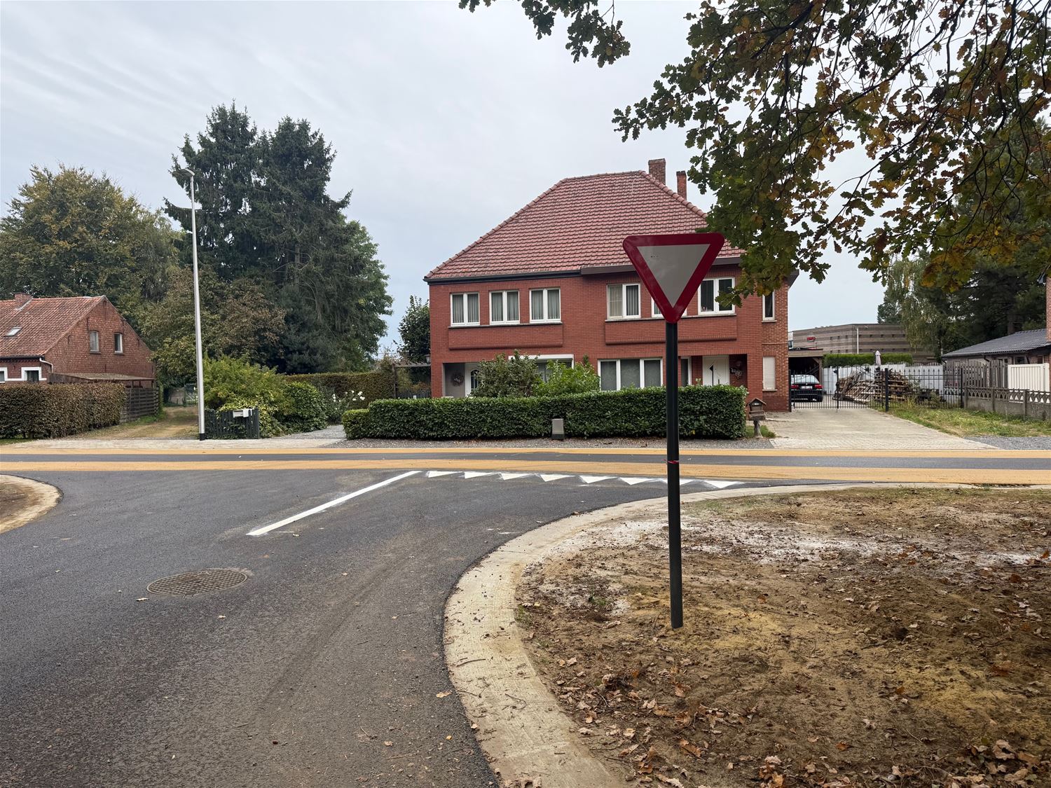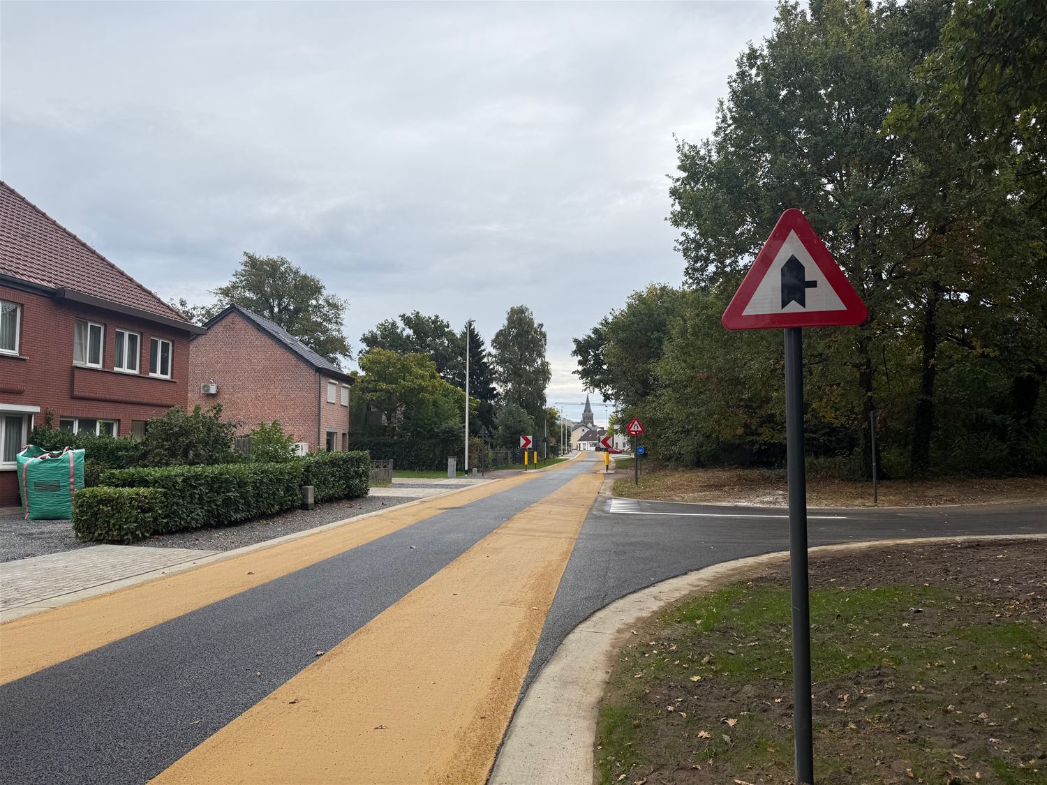 De fietssuggestiestroken in de Kapelstraat en de zijstraten zijn in kleur gezet en ook de andere signalisatie op de zijstraten wordt vandaag gespoten. Grootste nieuwigheid in het vernieuwde deel van de straat is dat de voorrang van rechts niet langer geldt. (foto's Julien Maebe)86508