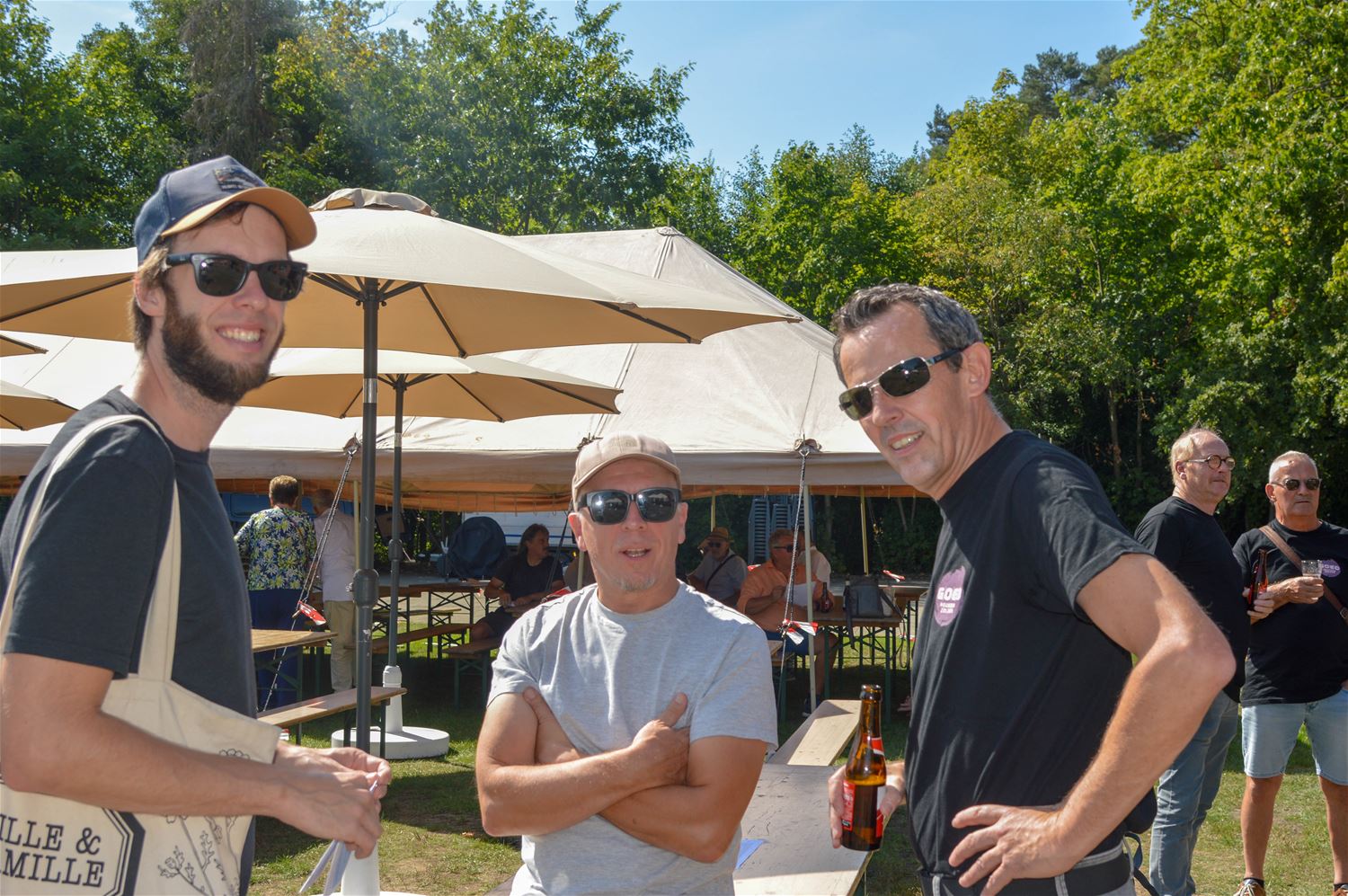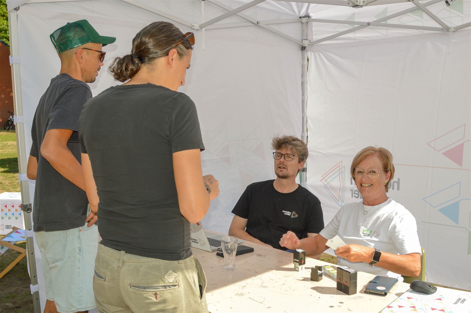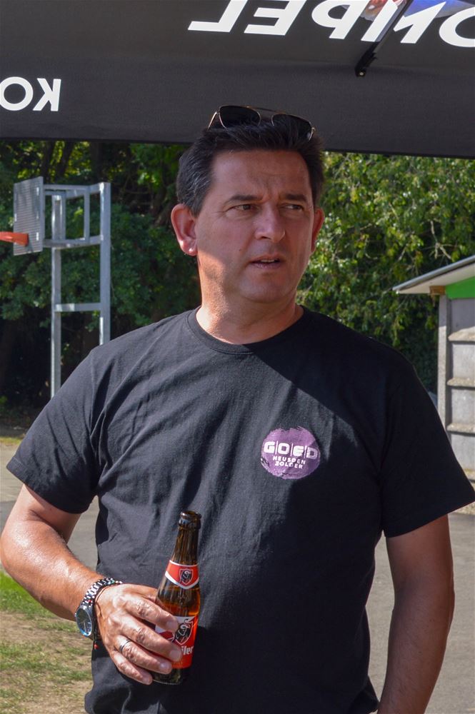 ‘Rondje Bestuur’ streek vandaag neer in Berkenbos. Ieder jaar rond de zomer trakteert het College van Burgemeester en Schepenen de inwoners op enkele drankjes tijdens een receptie. Daarbij worden de kerkdorpen in een beurtrol aangedaan, en de traktatie sluit aan bij een plaatselijk evenement. Vandaag mochten burgemeester en schepenen dus enkele uren pintjes en frisdrank serveren tijdens Berkenbos Leeft. En ’t was dorstig weer, dus de traktatie werd gesmaakt. Maar voor alle duidelijkheid, het was een traktatie vanuit de gemeente, niet vanuit GOED zoals de t-shirts misschien de indruk konden wekken. Dat was evenwel om deel te nemen aan het Kubb-tornooi, waarin ze het ook goed probeerden te doen. (foto’s David Amgad)86281