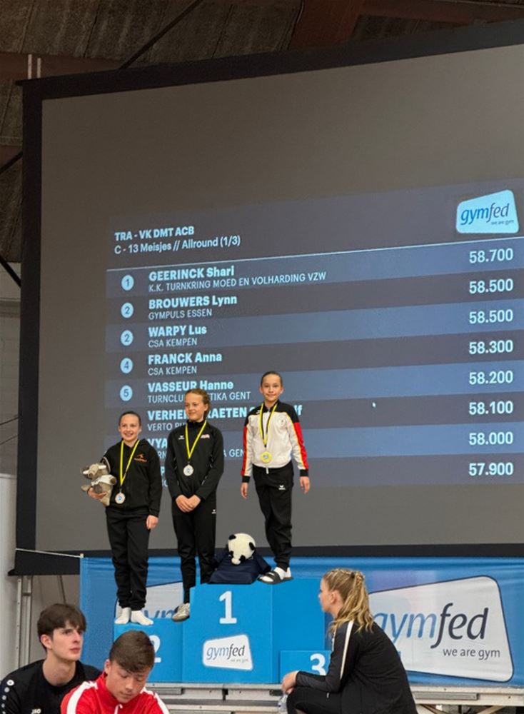 De gymnasten van Turnkring Moed en Volharding hebben sterk gepresteerd op het Vlaams kampioenschap dubbelmini trampoline. Tyano Steegmans en Shari Geerinck kroonden zich tot Vlaams kampioen na knappe en overtuigende reeksen. Ook Joyte Aresu, Sophie Geysen, Maya Beerten, Charlotte Vanoppen en Meryem Horzum lieten mooie oefeningen zien en hielden met veel inzet de eer van de club hoog. (foto’s Lieze Vogels)88371