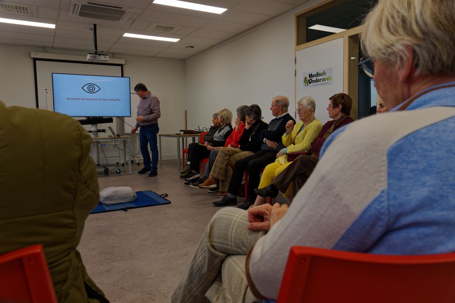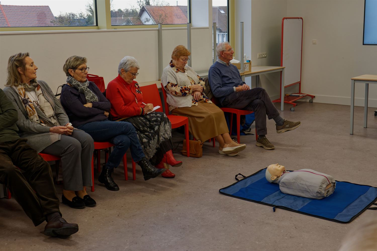 Leden van Neos Heusden-Zolder volgden vandaag een les ‘hartveilig’. Voorzitter Lode Schops van Rode Kruis Helzold en dokter Monique Frederix, gaven een boeiende les over hoe te reageren in noodsituaties. Met praktische voorbeelden uit het dagelijkse leven toonden ze welke acties en in welke volgorde, er ondernomen moeten worden. De leden konden zelf oefenen in hartmassage, beademen, een AED toestel aanleggen … Na afloop hadden de deelnemers meer vertrouwen om in te grijpen bij noodsituaties, want niets doen is altijd fout. (foto’s Robrecht Froyman)87248
