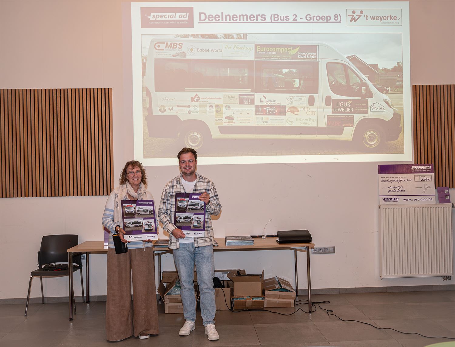 Bij ’t Weyerke zijn vanavond drie nieuwe busjes voorgesteld, die worden gebruikt voor het transport van de zorggebruikers. Het gaat om een stevige investering, maar die werd voor de investering verlicht door tal sponsors die hun publiciteit op de busjes vermeld zagen. Daarvoor konden 't Weyerke en Kamiano een beroep doen op Special ad, dat bedrijven koppelt aan maatschappelijke initiatieven via reclame op voertuigen. Onder meer scholen, vzw’s en zorginstellingen kunnen er een beroep op doen, terwijl de sponsors zichtbaarheid krijgen via mobiele advertenties op de weg. Ruim 100 sponsors gingen daar op in. Manager Philippe De Bondt van Special ad overhandigde een cheque van 2.500 euro aan ’t Weyerke.