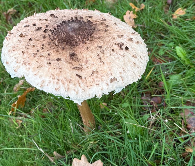 Ook al klagen mycologen misschien over een zwak paddenstoelenseizoen, er zijn in Heusden-Zolder al heel wat soorten gespot. In de dorpstuintjes kwamen ze vandaag nog een grote parasolzwam van 22 cm doormeter tegen, ze hebben hem – in tegenstelling tot de pompoenen – uiteraard niet geoogst. (foto Julien Maebe)86674