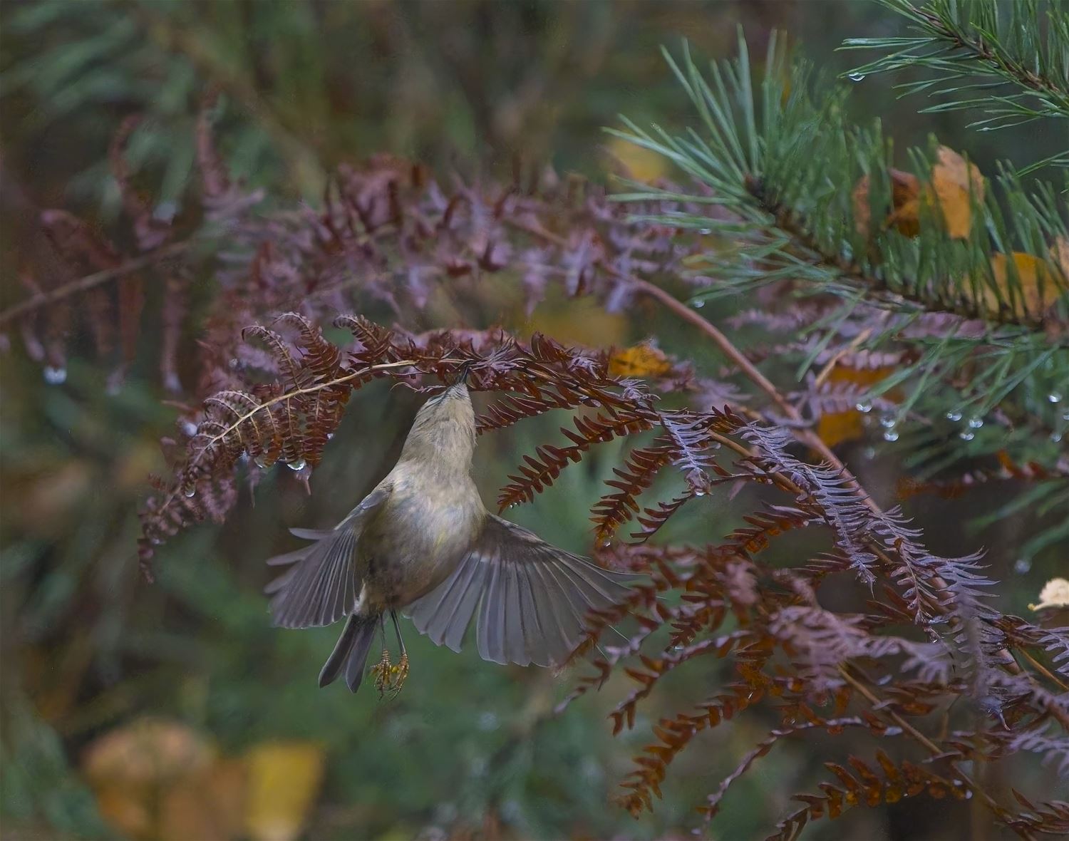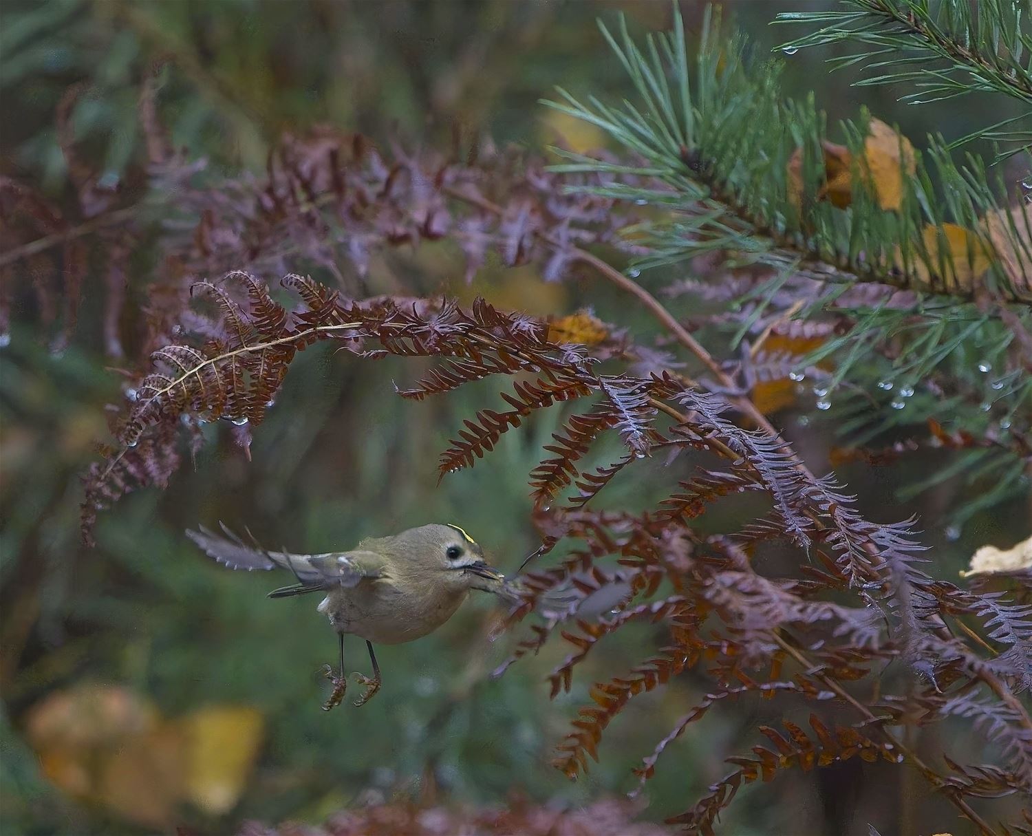 Enkele weken geleden is het goudhaantje, het kleinste vogeltje van Europa, hier al de revue gepasseerd. Het eet vooral insecten, kleine larven en motten. En zoals elke vogel lest het goudhaantje zijn dorst vooral in ondiepe plassen. Maar als het flink geregend heeft, dan worden de plassen dieper en daar heeft het een hekel aan. Dit goudhaantje vond daar een creatieve oplossing voor. Het ging fladderen onder de waterdruppels, die aan de varens hangen om zo in de druppels te pikken met zijn spitse snavel. (foto’s Johan Put)86985