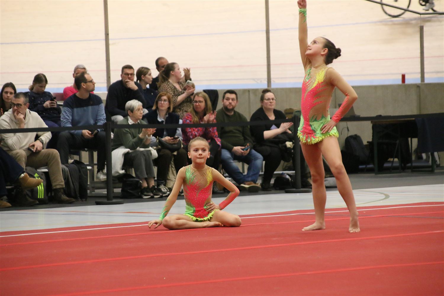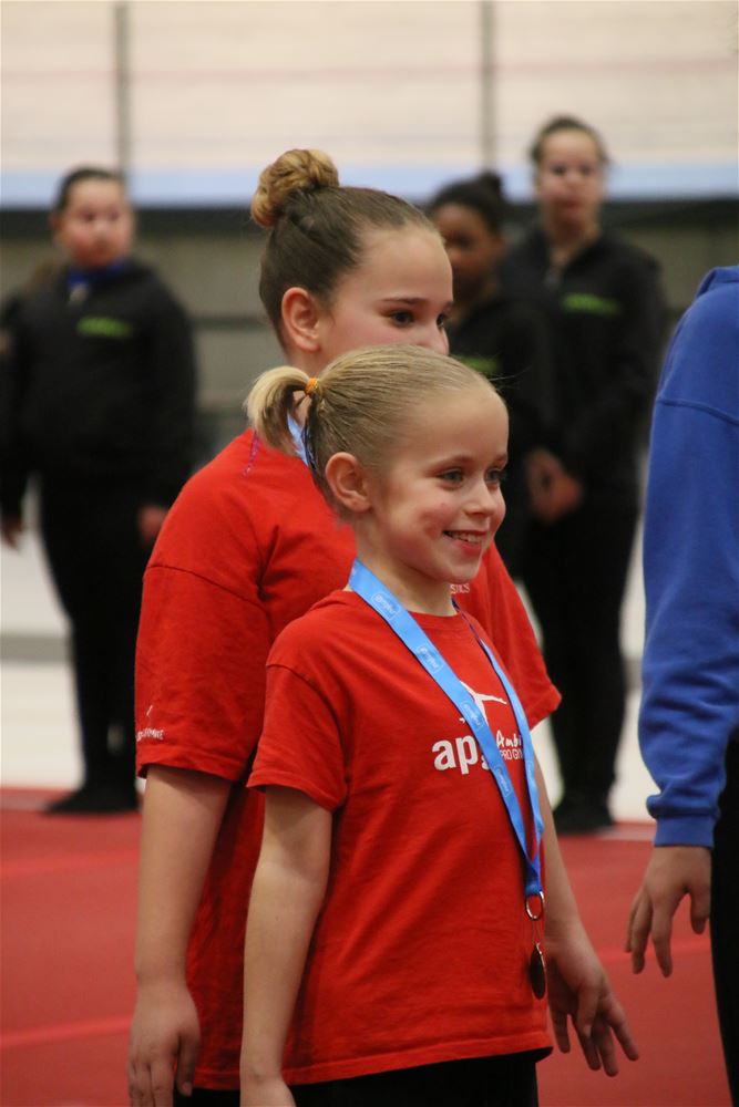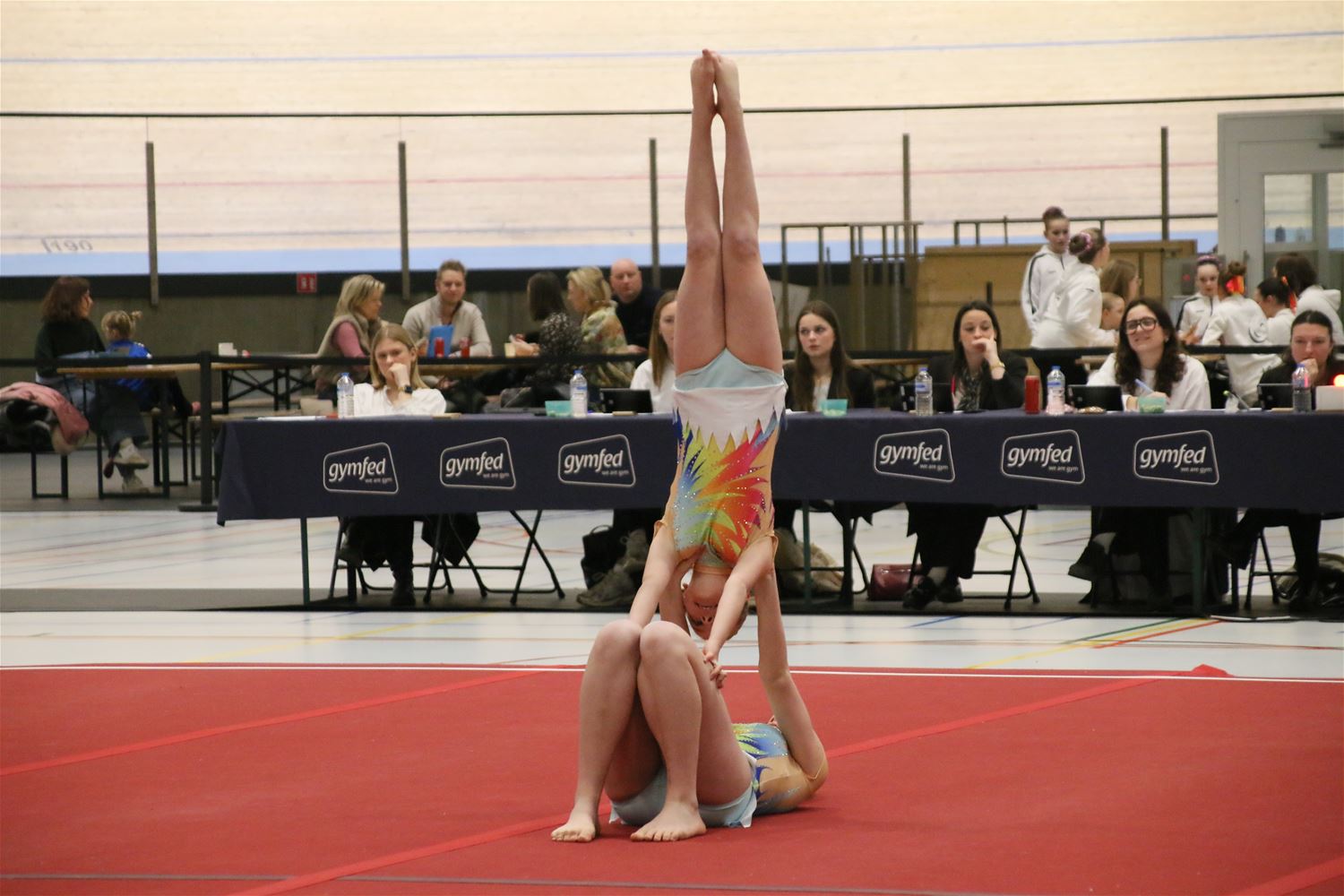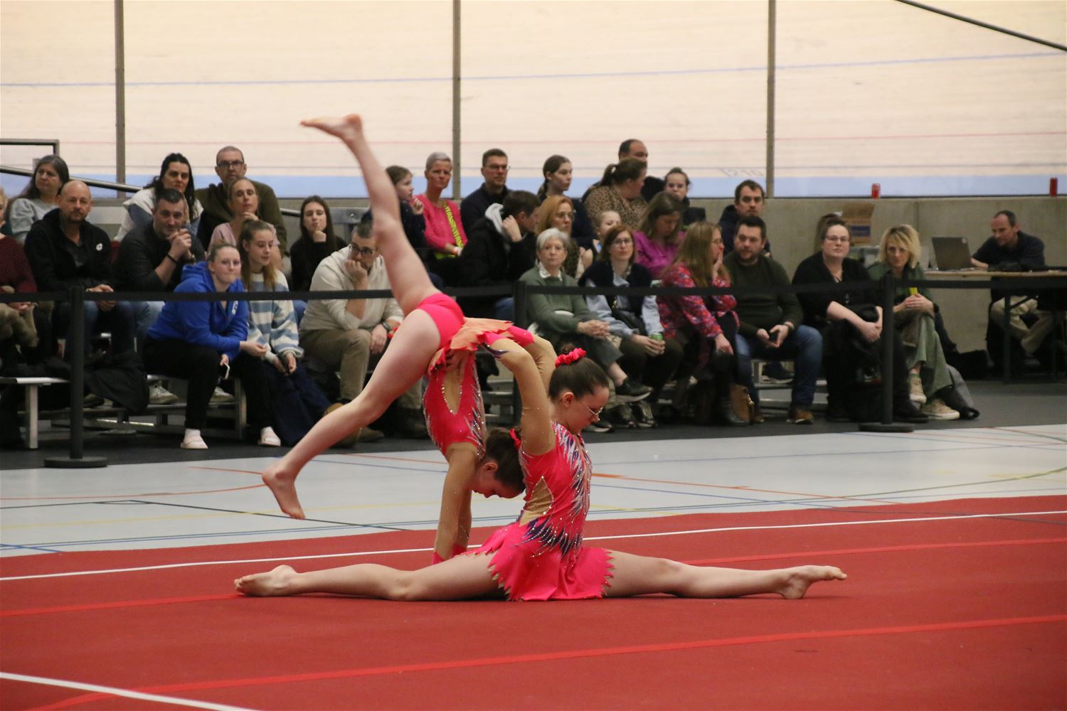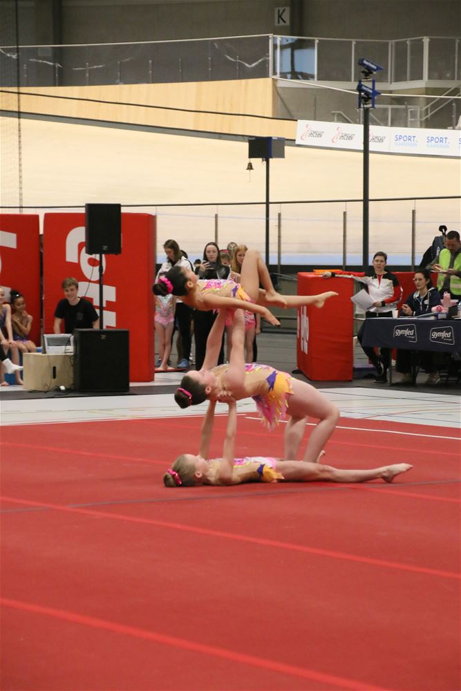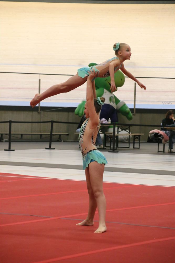 Op de eerste dag van het acro-tornooi voor recreanten dat Moed en Volharding in de Velodroom organiseert viel er al heel wat te beleven. Het publiek was bijzonder talrijk aanwezig en kreeg prachtige acro-nummers voorgeschoteld. Ook de allerjongste deelnemers dwongen bewondering af met hetgeen zij al op de mat presteerden. Overigens gaat het hier om gymnasten die tussen 2 en 5 uur per week trainen. En de ultieme beloning voor de jonge deelnemers was natuurlijk de medaille die aan het einde wachtte. Vandaag waren er drie sessies, morgen staan er nog twee op het programma. (foto’s Kyano Liefsoens)87844