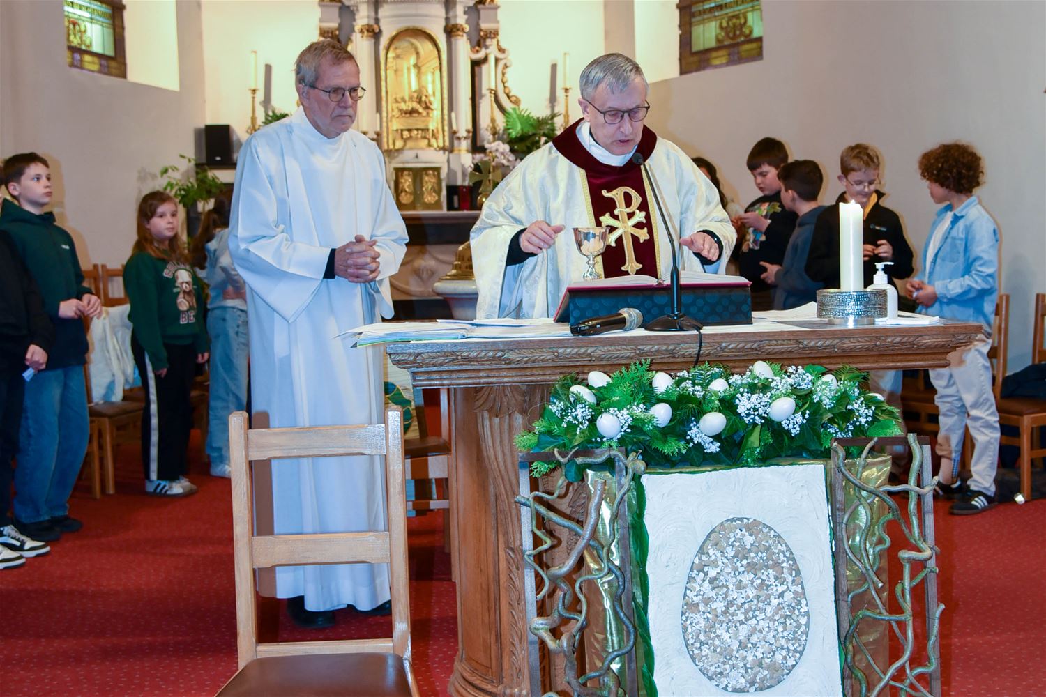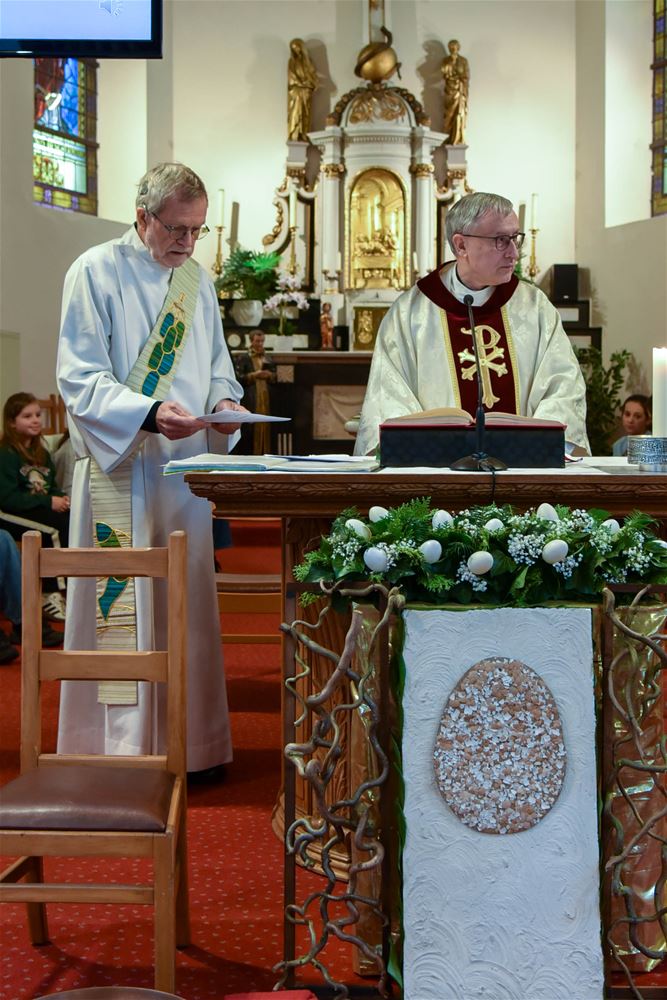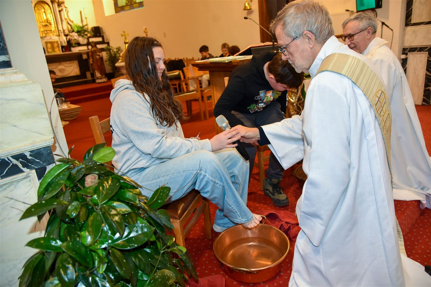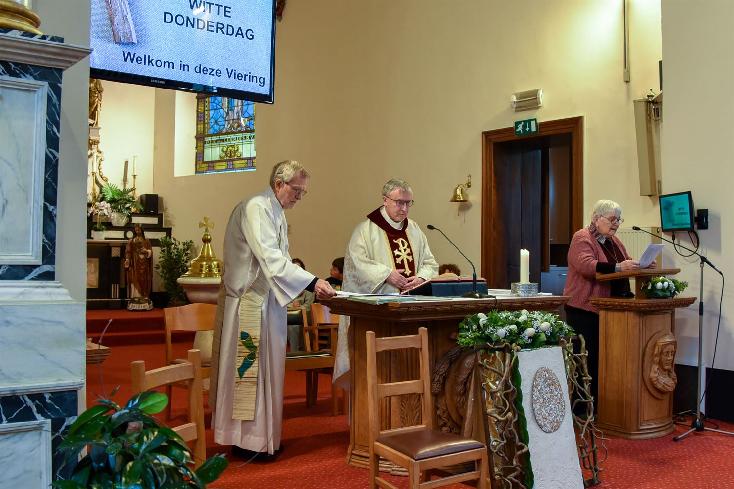 In de kerk van Eversel hebben vanavond enkele tientallen gelovigen de Witte Donderdag viering bijgewoond. Die werd voorgegaan door pastoor Guido De Waegeneere en diaken Ward Ceyssens. Ook de vormelingen hadden hun rol in de viering en pastoor en diaken gingen over tot hun symbolische voetenwassing, verwijzend naar het Laatste Avondmaal. Daarmee zijn de paasdagen ingezet. (foto’s David Amgad)
