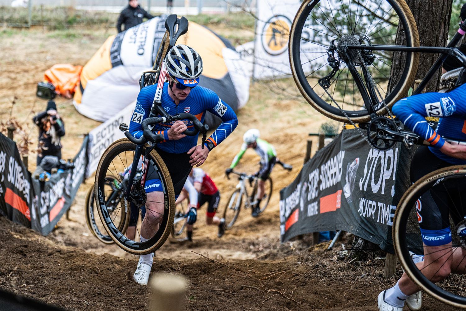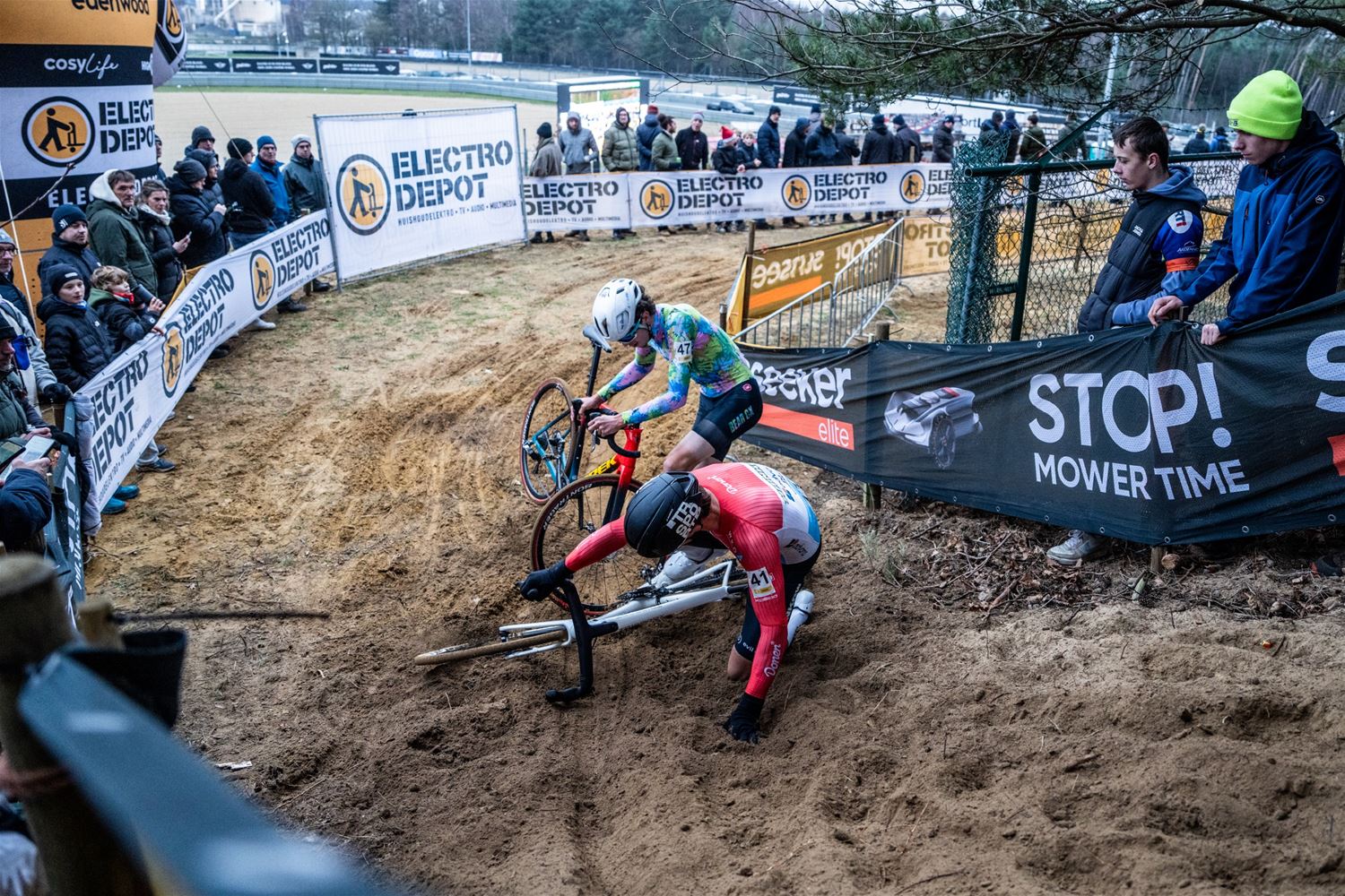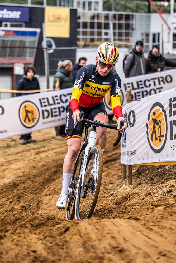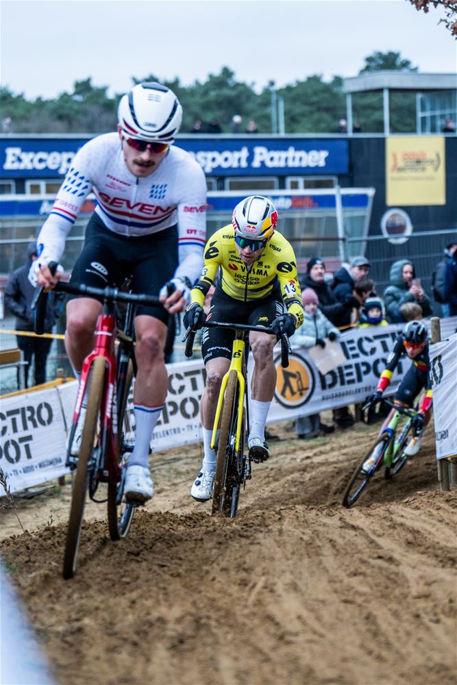 Na een razendspannende koers werd Wout Van Aert op de meet geklopt door de jonge Nederlandse kampioen Tibor Del Grosso. Beiden hadden het tweede deel van de koers samen gekleurd. Wout Van Aert kende niet de beste start en moest helemaal vanuit de achtergrond terugkomen. Dat lukte ook en samen met Del Grosso schudde hij de anderen uit het wiel. Van Thibau Nijs was op dat ogenblik al lang geen sprake meer, hij kende een offday en verzeilde in de achtergrond. Luid aangemoedigd zette Wout Van Aert op 100 meter van de streep de sprint in, maar Del Grosso kwam terug en had voldoende eindjump in zijn benen om alsnog te winnen. Geen van der Poel maar dus een andere Nederlander die het feestje van Wout van Aert kwam verstoren. Derde werd Michael Vanthourenhout. (foto’s DD)