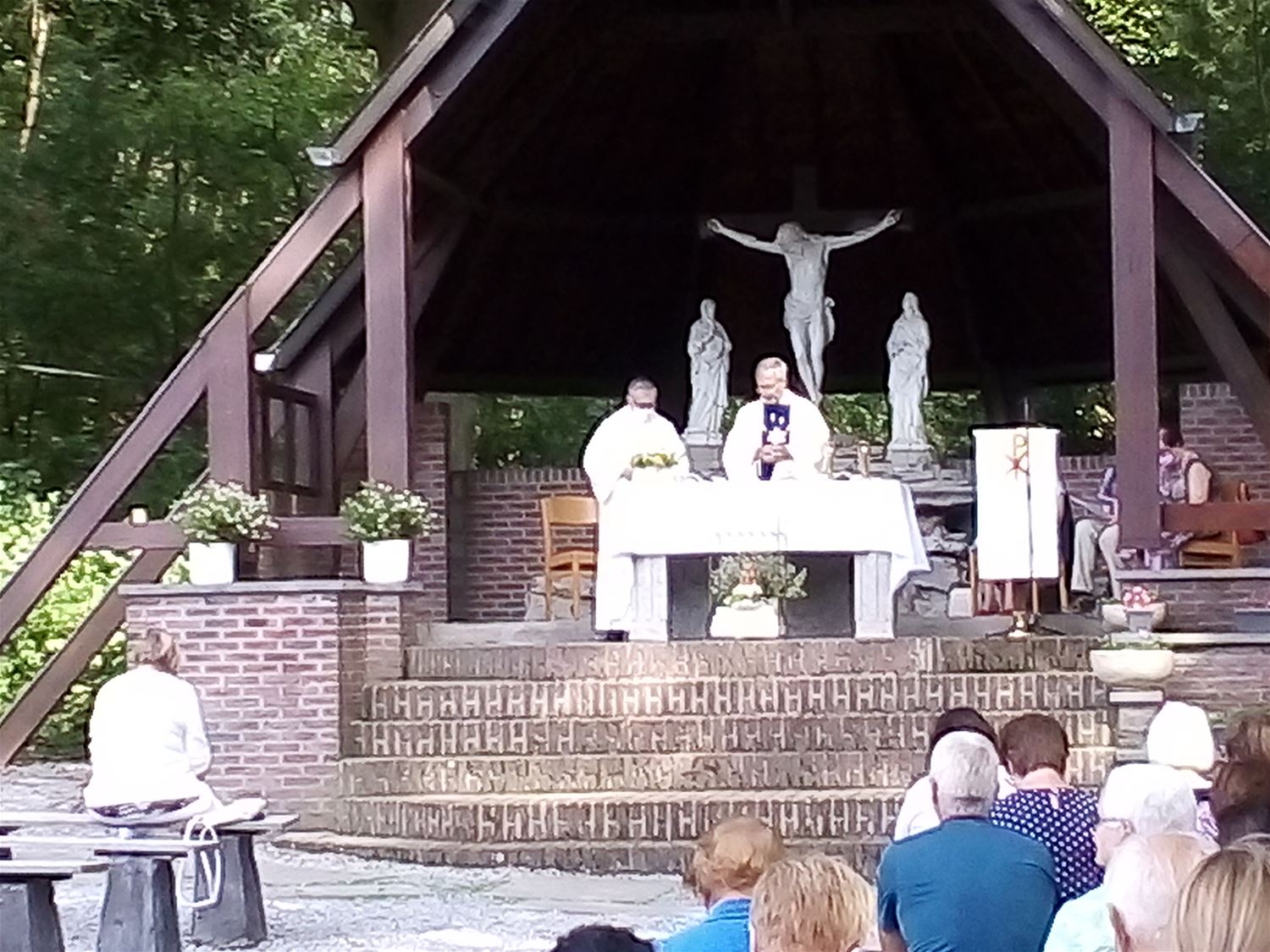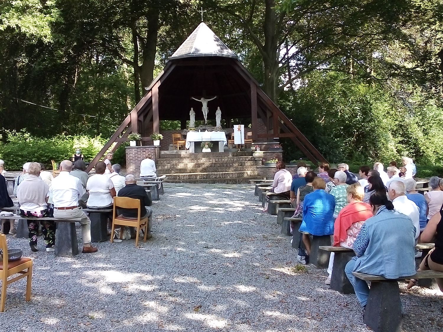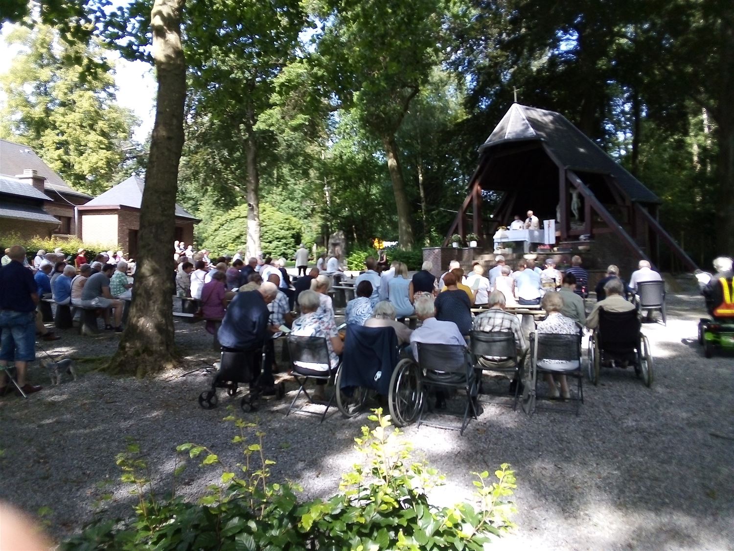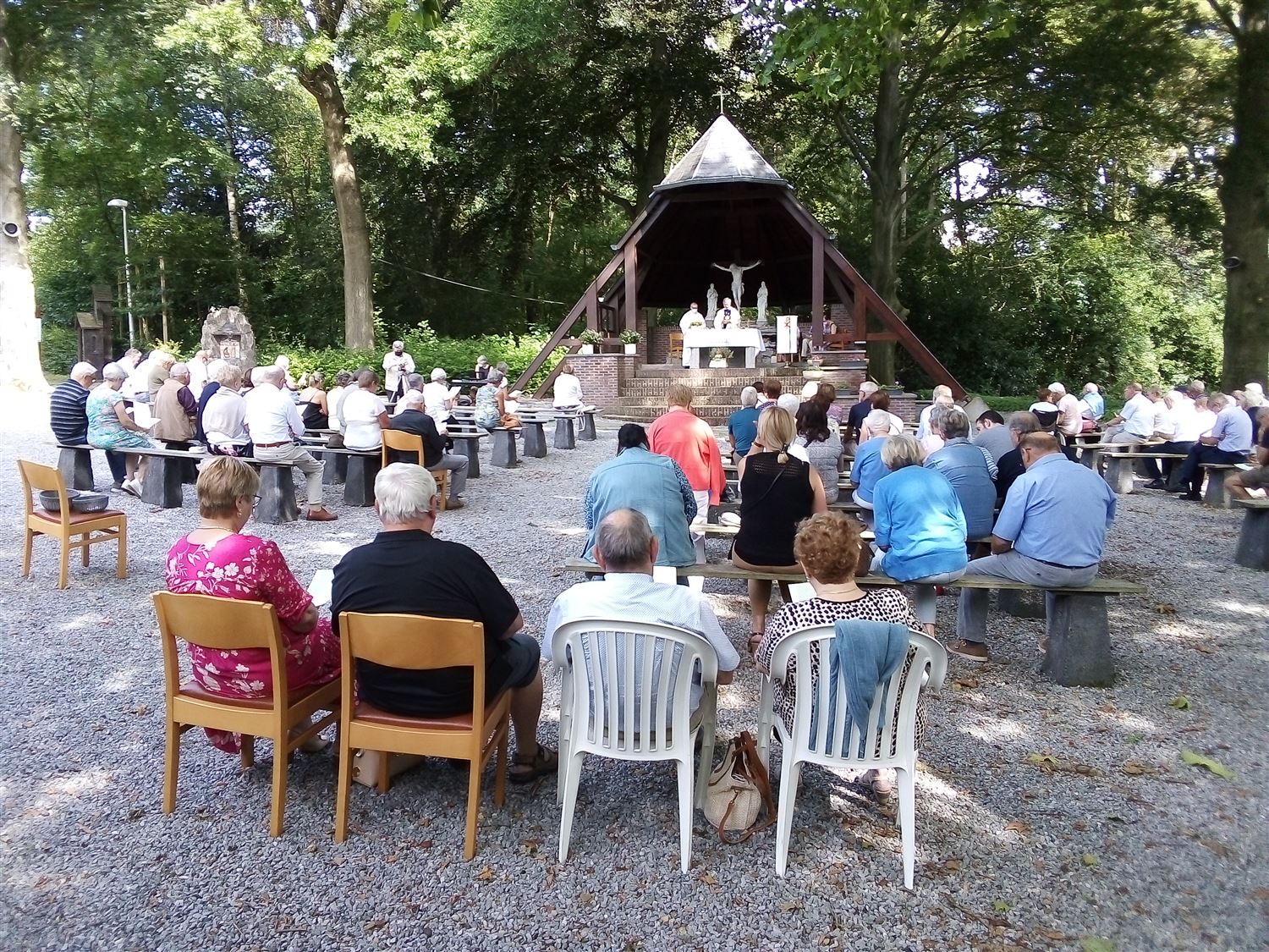 De oproep van de vier parochies binnen federatie Heusden om vandaag naar 't Koersels Kapelleke af te zakkenvoor een bedevaart kende duidelijk gehoor. Zeker 120 gelovigen verzamelden in een zonovergoten kapelomgeving voor een eucharistieviering voorgegaan door pastoor Guido van Heusden en pastoor Benny van Koersel. 5 Marialiederen - want zo hoort dat op 15 augustus - werden voluit meegezongen op basis van de uitgedeelde teksten. Nadien werden de stemmen trouwens gesmeerd met een ijsje of drankje. (foto's Willy Van Aelst)