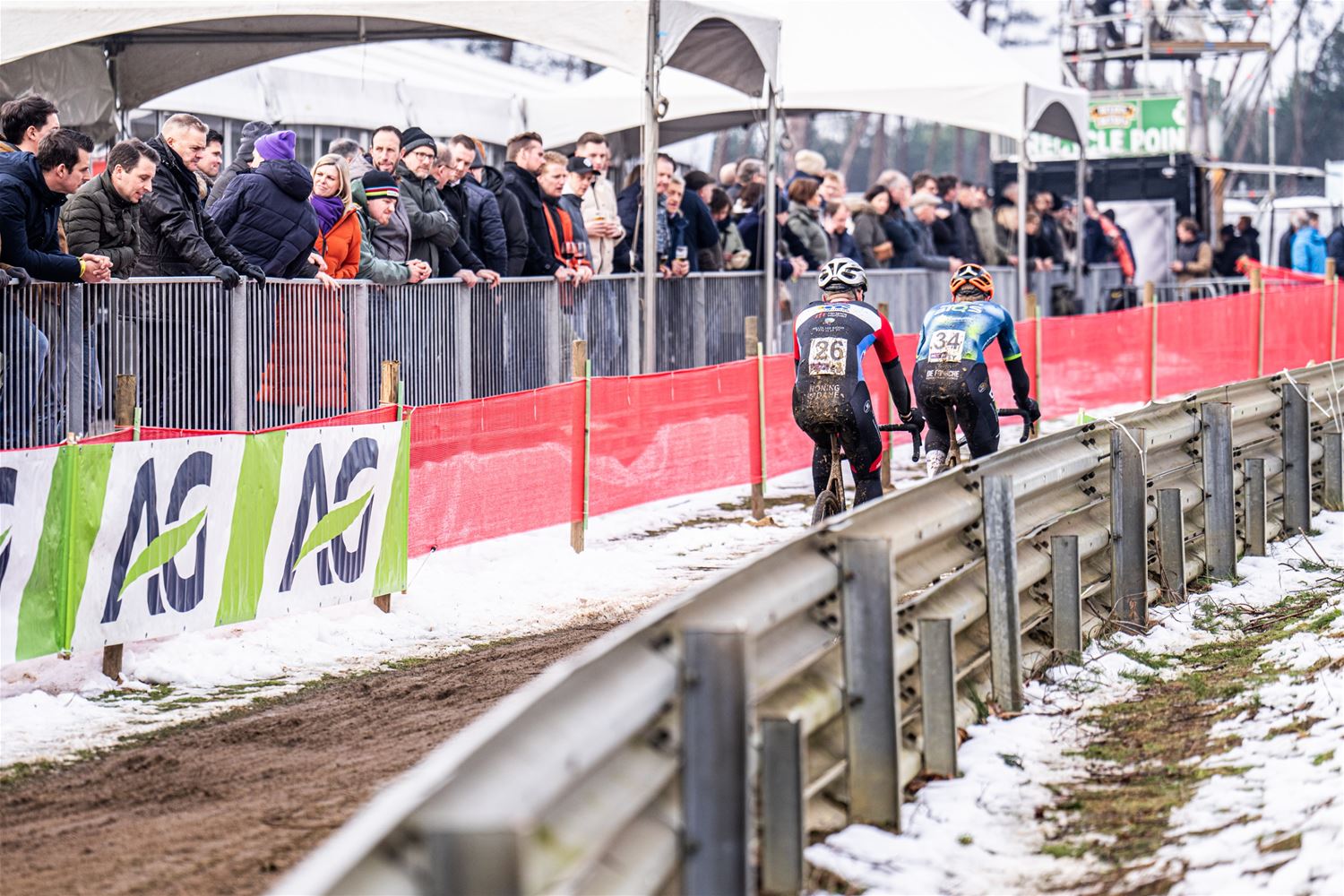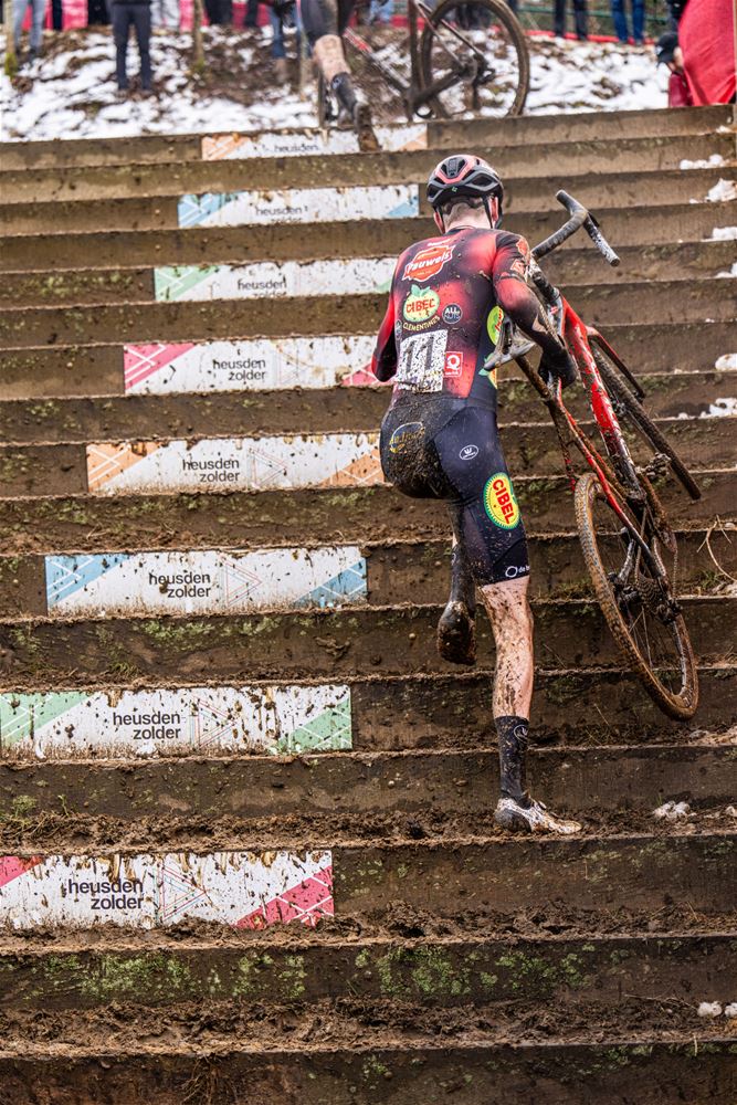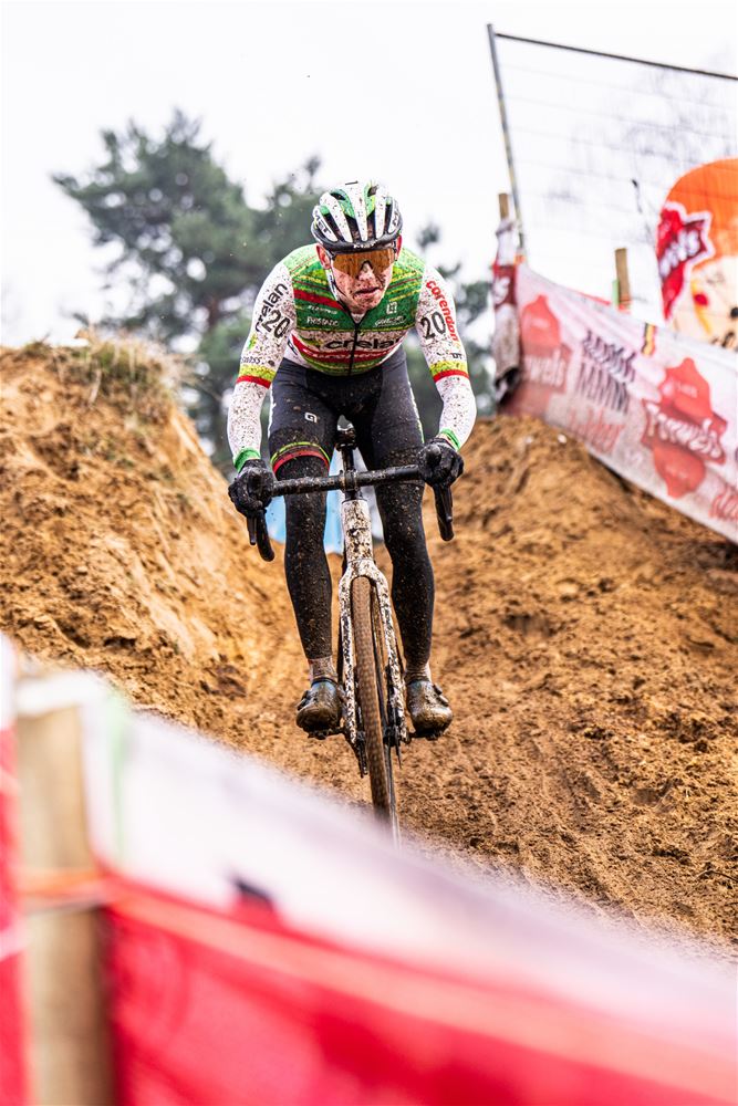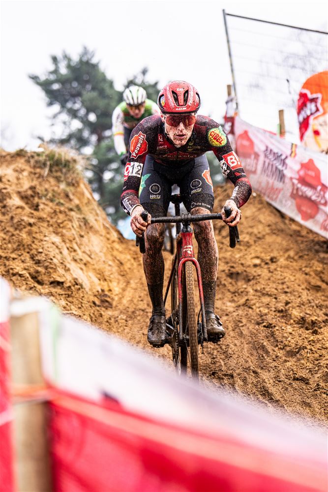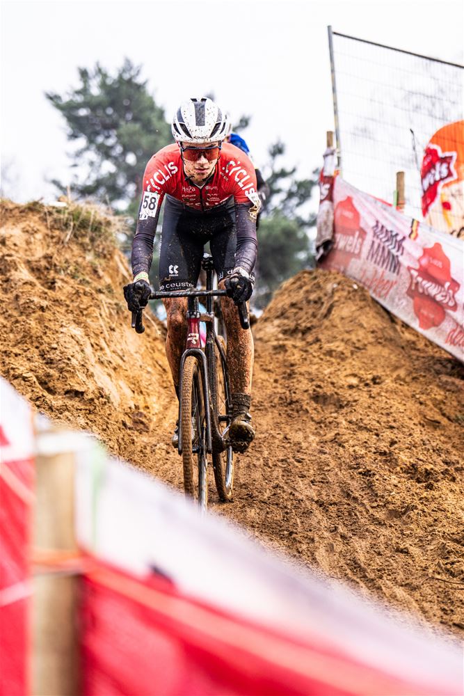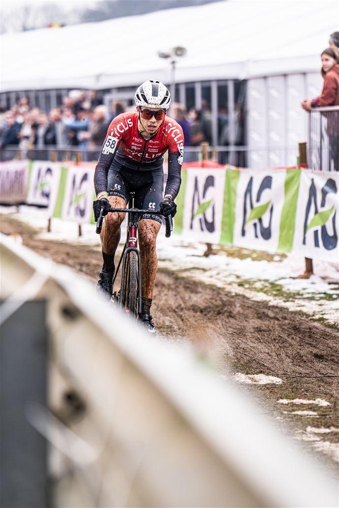 De titelstrijd bij de beloften was ook een bijzondere spannende koers. Terwijl topfavoriet Jente Michels werd teruggeslagen naar de zesde plaats en daar ook eindigde, tekende zich vooraan een trio af dat de medailles zou gaan verdelen. Sil De Brauwere moest in de slotfase de rol nog lossen en moest zich tevreden stellen met brons, terwijl zijn ploegmaat Yordi Corsus de ultieme sprint aanging met Aaron Dockx. Corus zette de spurt van ver in, Dockx bleef kalm en kwam op het juiste moment uit het wiel om te triomferen en even later de Belgische driekleur te mogen aantrekken. (foto's DD)84199