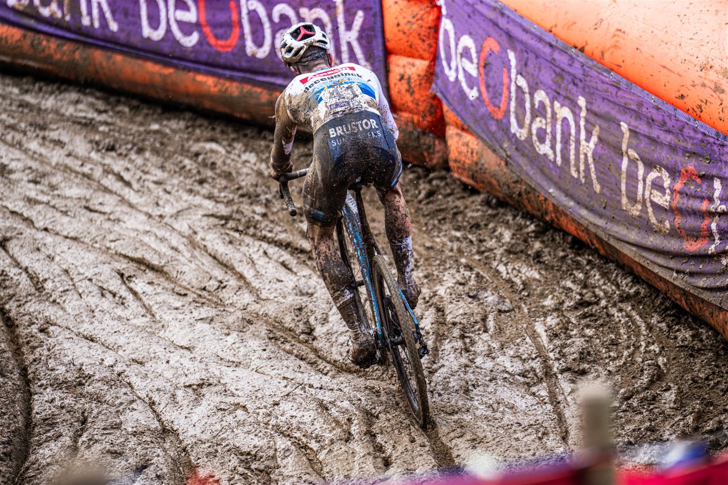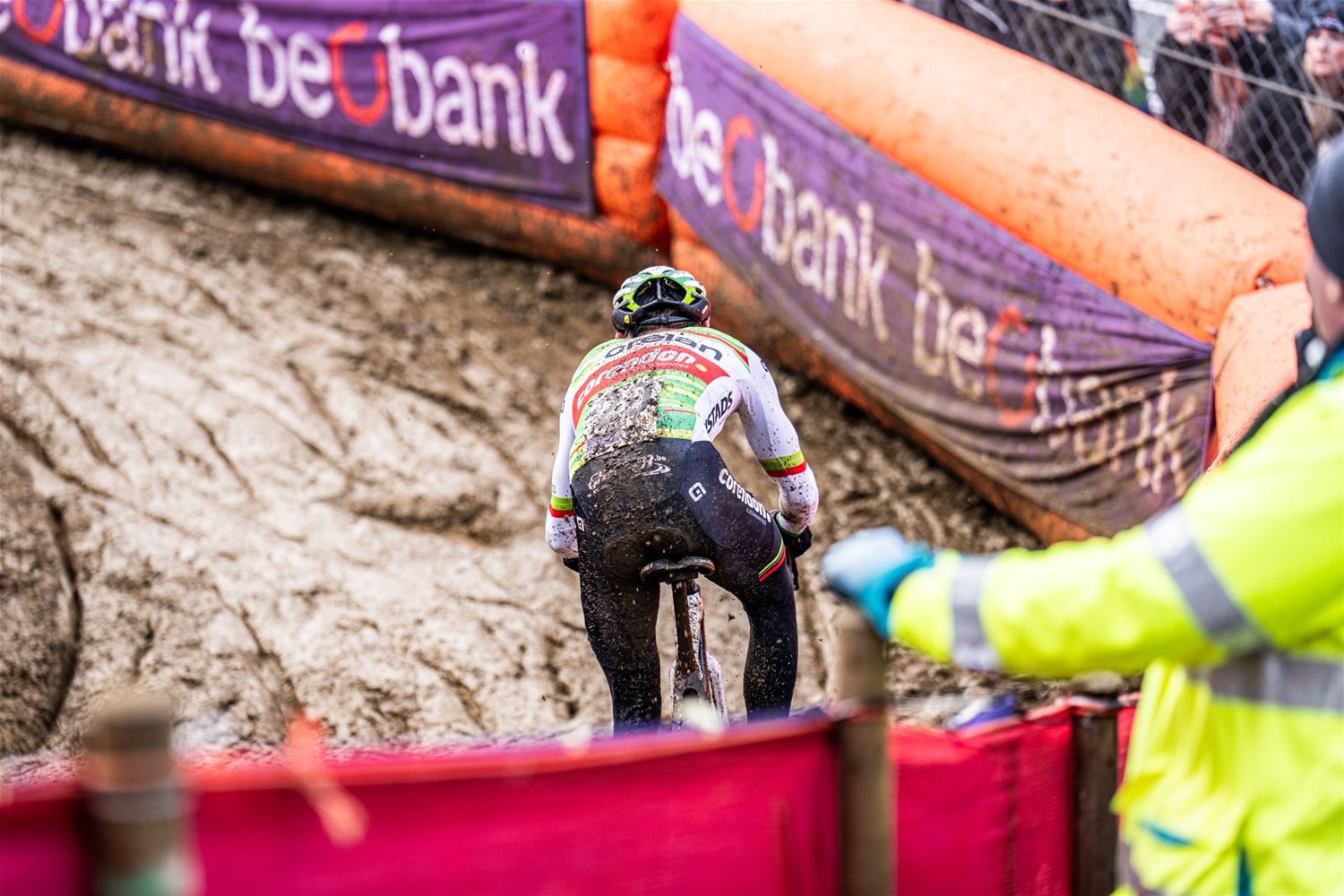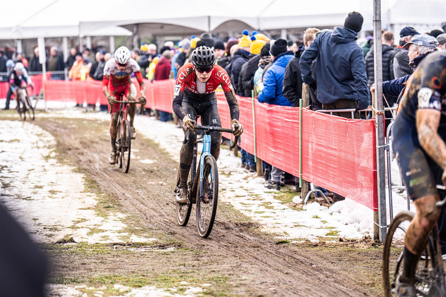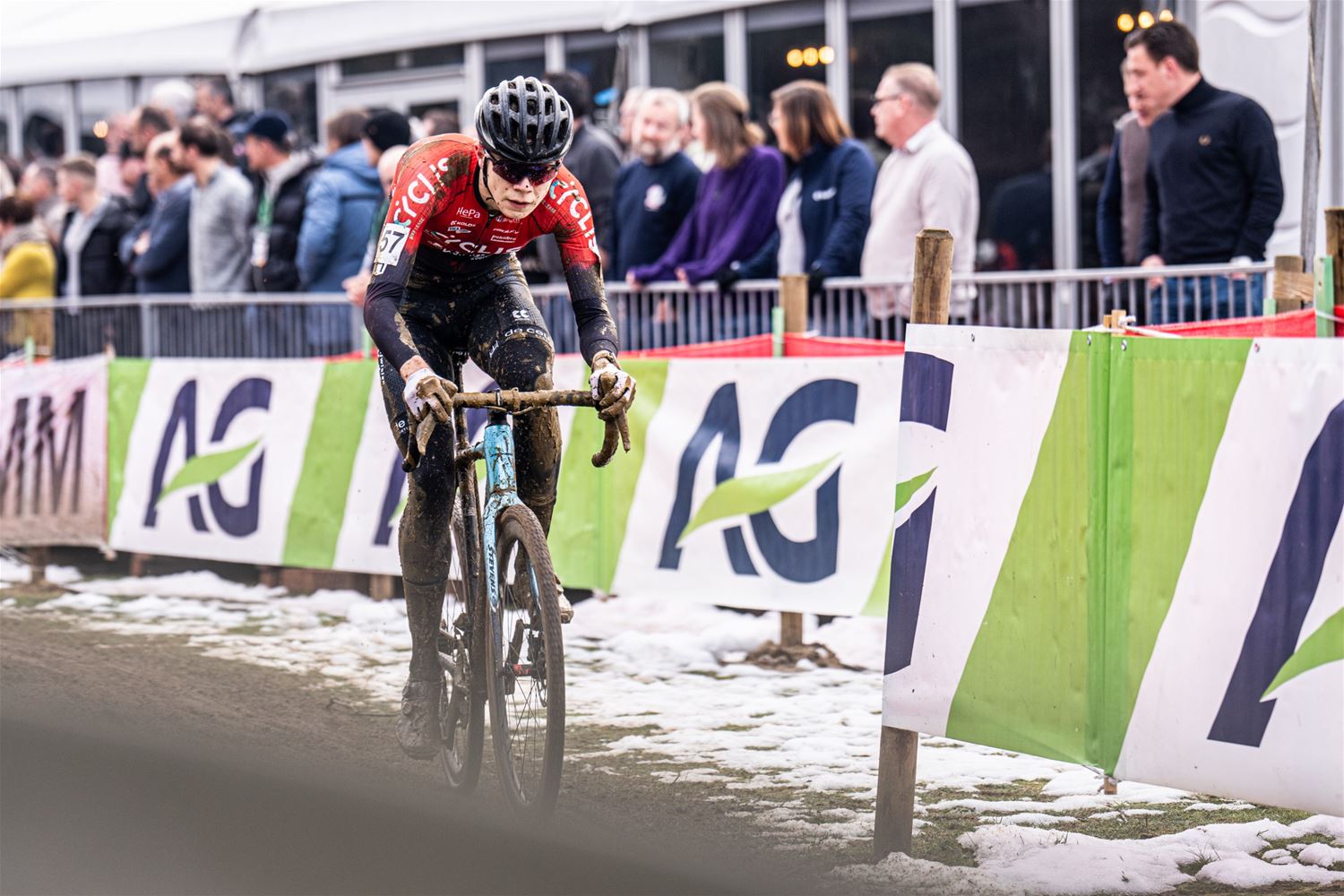 De titelstrijd bij de beloften was ook een bijzondere spannende koers. Terwijl topfavoriet Jente Michels werd teruggeslagen naar de zesde plaats en daar ook eindigde, tekende zich vooraan een trio af dat de medailles zou gaan verdelen. Sil De Brauwere moest in de slotfase de rol nog lossen en moest zich tevreden stellen met brons, terwijl zijn ploegmaat Yordi Corsus de ultieme sprint aanging met Aaron Dockx. Corus zette de spurt van ver in, Dockx bleef kalm en kwam op het juiste moment uit het wiel om te triomferen en even later de Belgische driekleur te mogen aantrekken. (foto's DD)84199