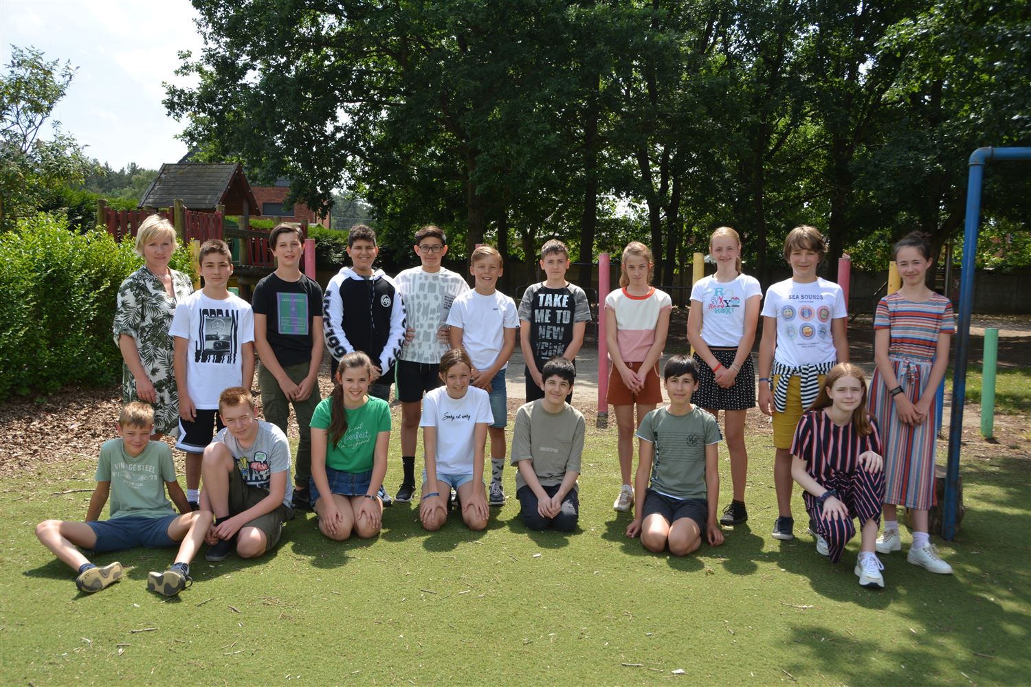 De leerlingen van 6A van De Springplank Eversel nemen stilaan afscheid van hun juffrouw Marijke Vaes. Het zijn Dervis Aliustaoglu, Yasin Bataray, Lotte Bernier, Lenthe Bogaerts, Mattijs Erregeerts, Pieterjan Fransis, Amber Goossens, Robrecht Gybels, Alani Indeherberge, Kobe Kenis, Melih Kislali, Berkay Kodak, Amine Lakridi, Wout Lekens, Mattia Pizzato, Amber Postelmans en Julie Vos. (foto Marina Poelmans)56226