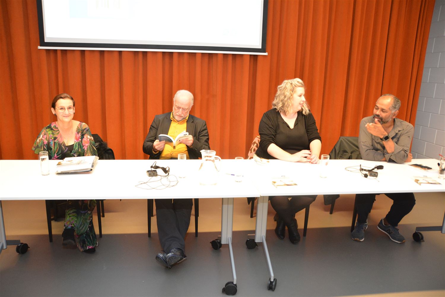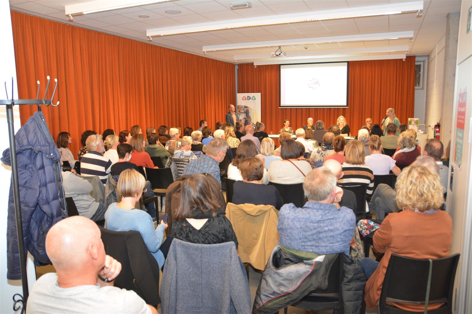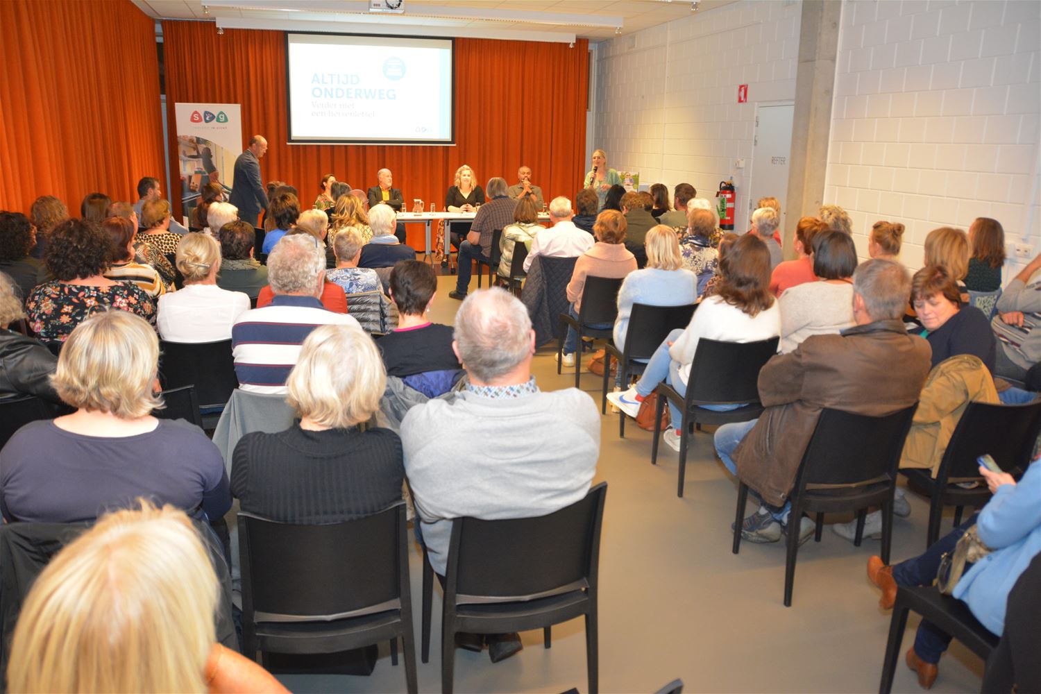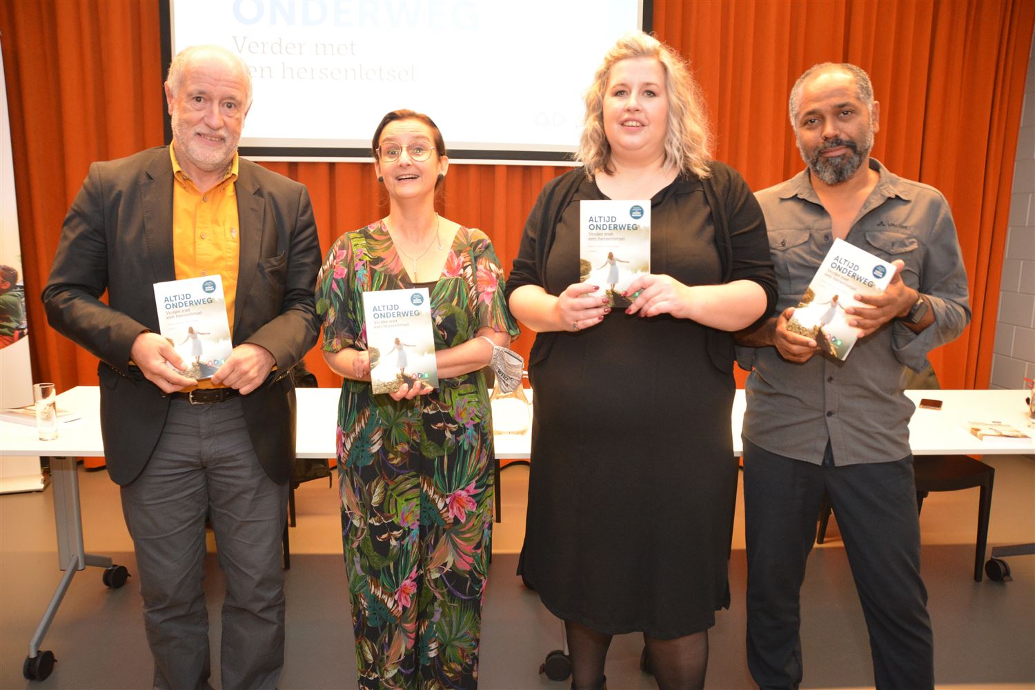 De multifunctionele ruimte van de bibliotheek was vanavond stampvol gelopen voor de boekvoorstelling 'Altijd onderweg' van Mieke Claes. Daarin doet ze het verhaal hoe ze als jonge vrouw bij een auto-ongeval een zware klap op het hoofd krijgt en daardoor verder moet leven met een 'niet-aangeboren hersenletsel' (NAH). Het is een pakkend verhaal, van een lange, moedige strijd. Het boek werd mee geschreven door dokter Dirk Liessens, die zorgde voor de medische input en ook vanavond het verhaal mee kwam vertellen. Ook present in de bib was zanger-muzikant Ronny Mosuse. Hij schreef het voorwoord bij het boek en heeft helaas ook ervaring door de hersentumor van zijn broer Robert en zijn moeder. Ook Miet, een kennis van Mieke die zelf in de sector actief is, kwam mee het verhaal ondersteunen. Het boek is uitgegeven door SIG vzw, het kost € 25 en kan via de webshop van SIG besteld worden.71039